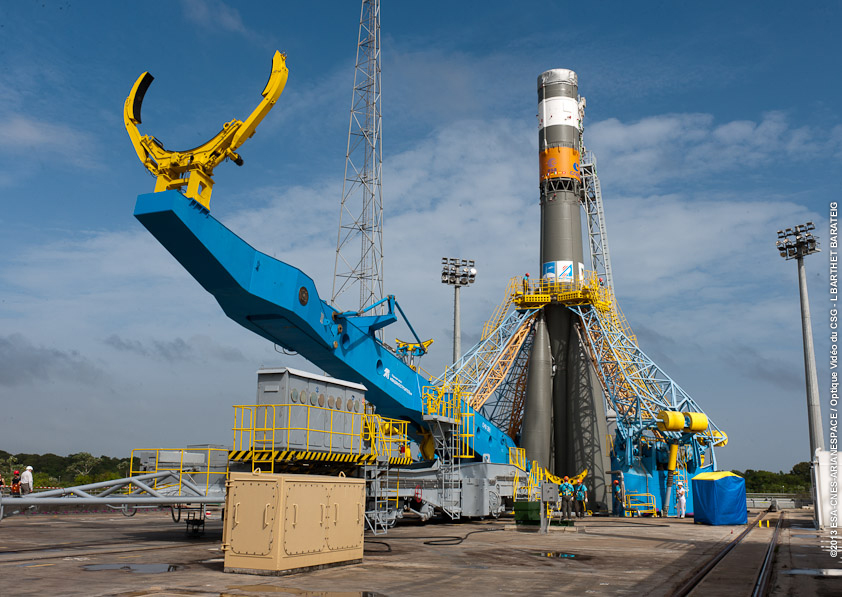 14 December 2013: The Gaia launch vehicle (VS06) at the launch pad. The Soyuz launcher is transferred to the launch pad in a horizontal position and raised vertically in-situ.