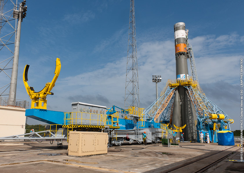 14 December 2013: The Gaia launch vehicle (VS06) at the launch pad. The Soyuz launcher is transferred to the launch pad in a horizontal position and raised vertically in-situ.