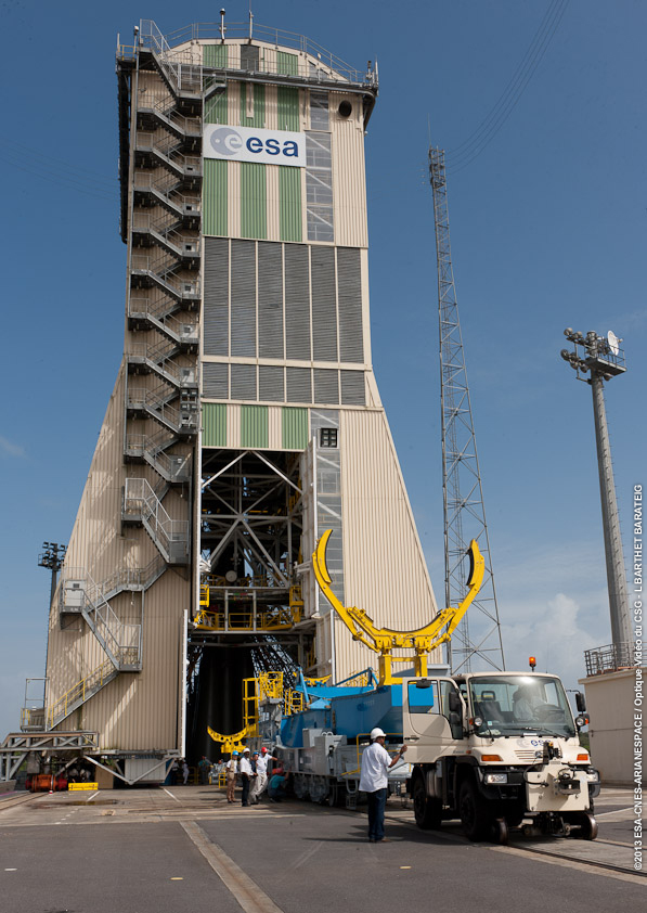 14 December 2013: The transporter that carried the Gaia launch vehicle to the launch pad departs from the mobile gantry that protects the Soyuz launcher at the launch pad.