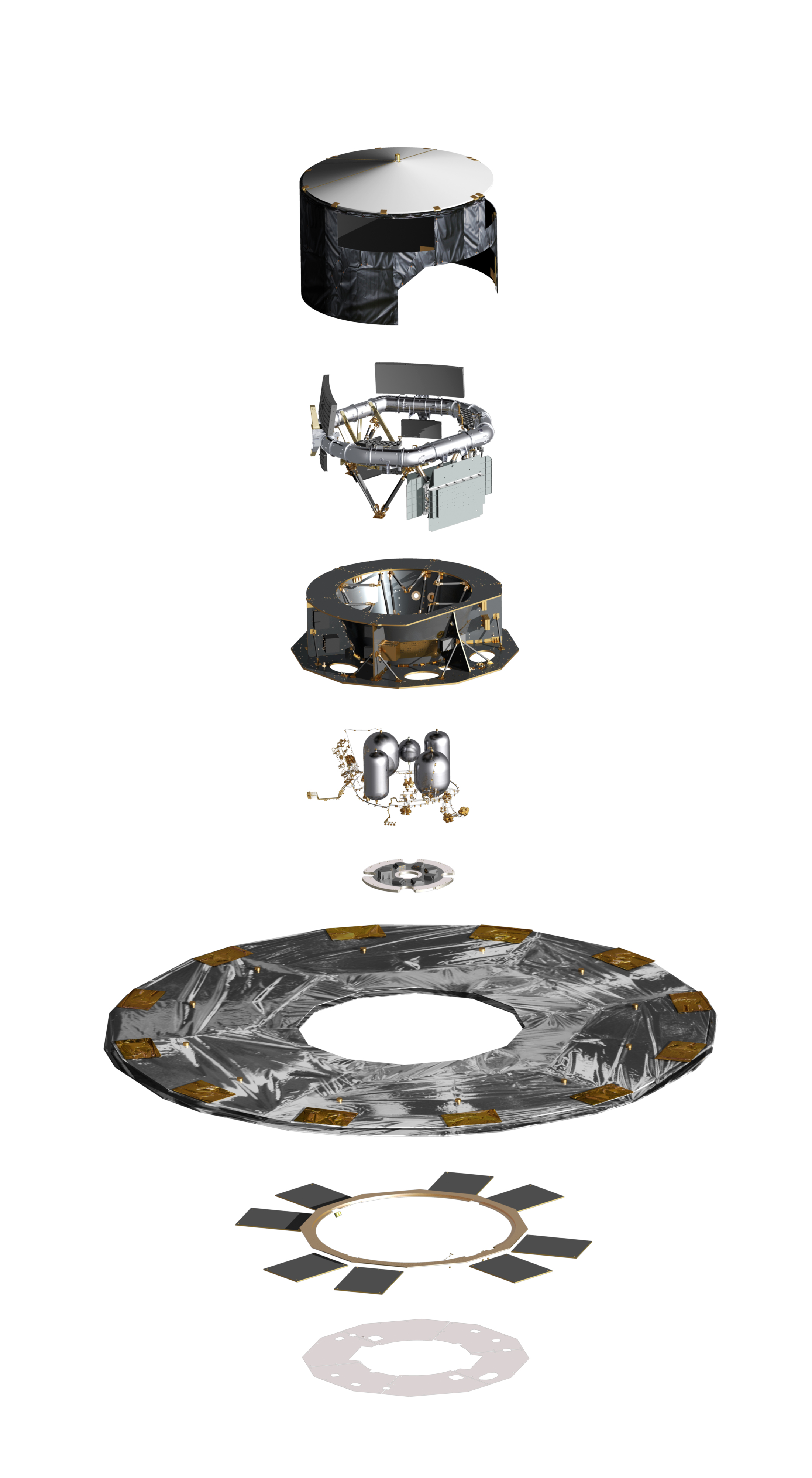 This exploded diagram shows the main elements of the Gaia spacecraft, including, from top to bottom: