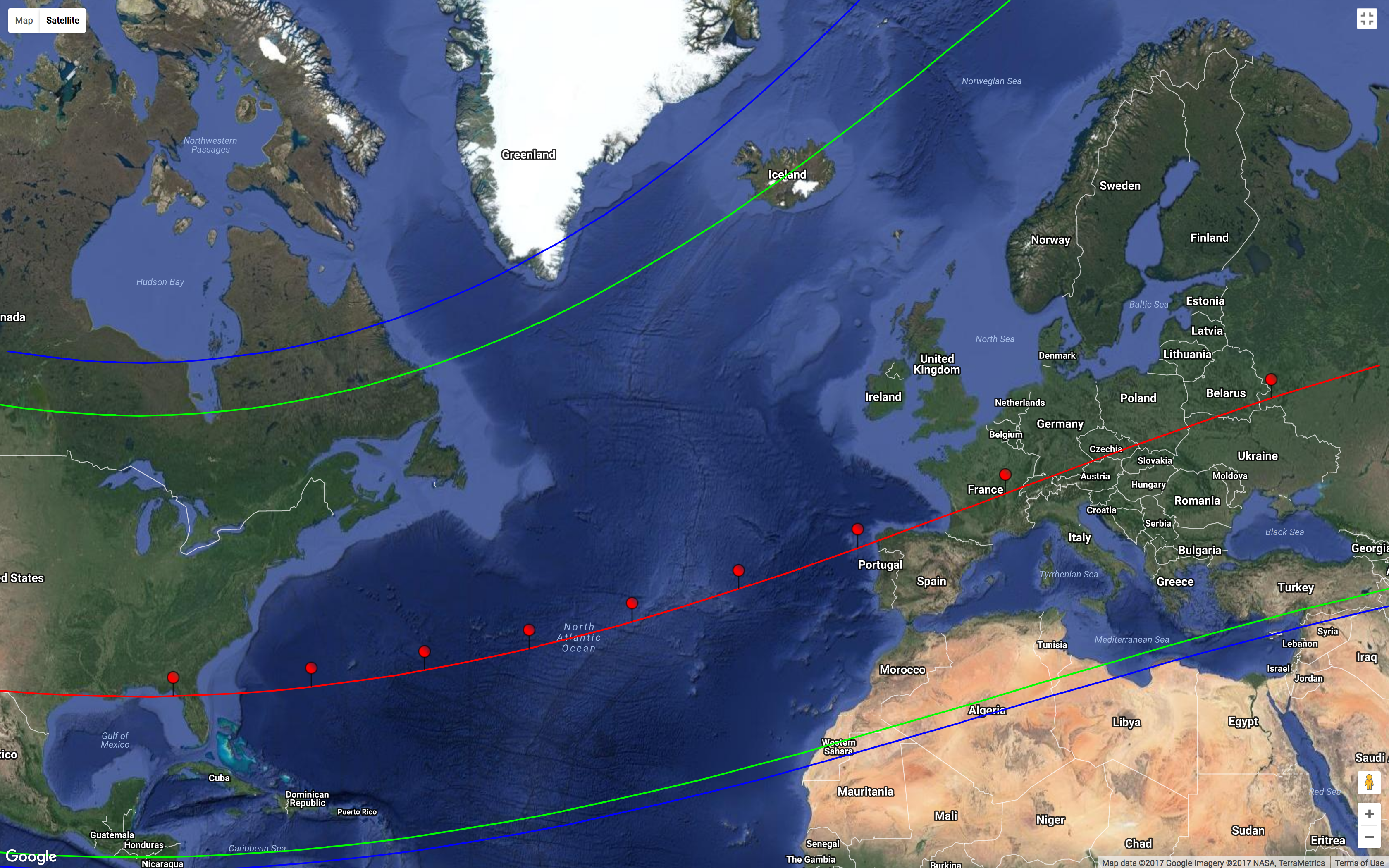 This map shows the track along which the occultation can be observed from Earth. The red line represents the central track – the best viewing position of the occultation. The green lines represent the boundary where the light from the star will be reduced by 50%. The blue lines are the 1% equivalent – this corresponds to the theoretical limit of detection of the occultation. Each red pin is spaced by one minute. The path goes from East to West.
