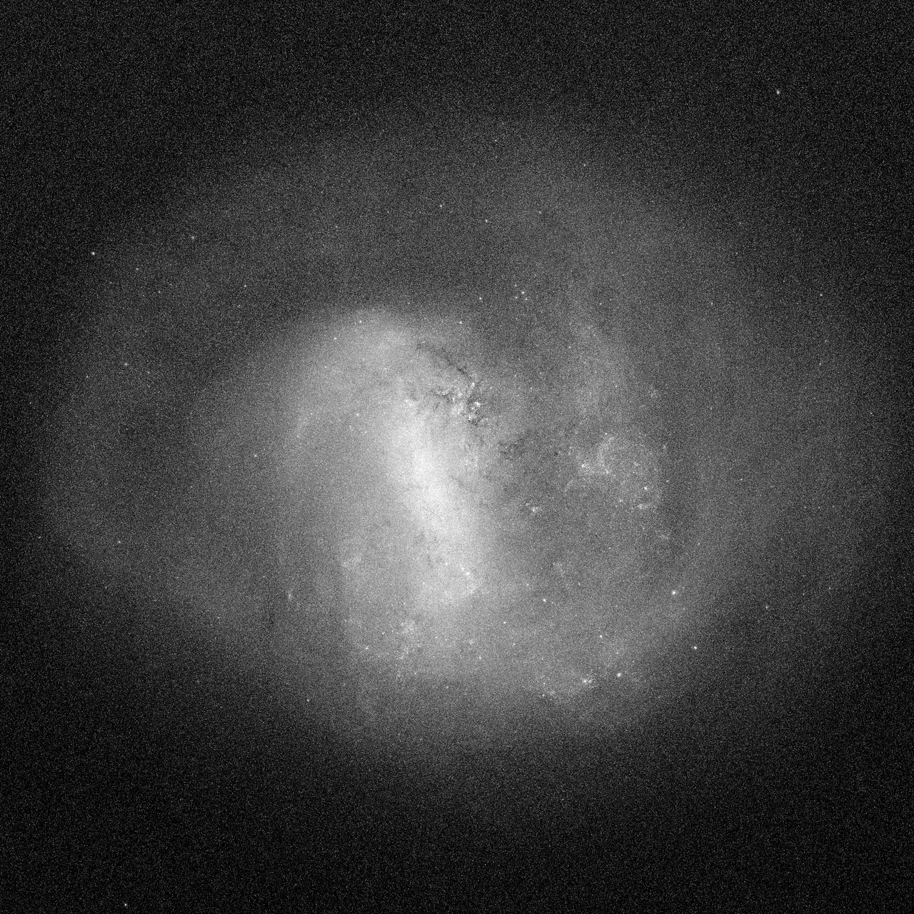 The image is dominated by the brightest, most massive stars, which greatly outshine their fainter, lower-mass counterparts. In this view, the bar of the LMC is outlined in greater detail, alongside with individual regions of star formation like the bubbling 30 Doradus, visible just above the centre of the galaxy.