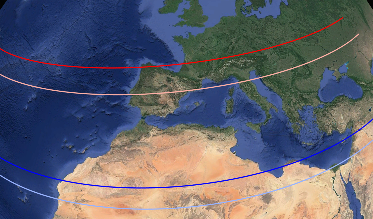 This map shows the track along which the occultation could be observed from Earth. The red line represents the central track – the best viewing position of the occultation – that was calculated using the preliminary position of the occulted star from the upcoming second release of Gaia data (Gaia DR2), while the blue line indicates the corresponding estimate of the southern limit to observe the occultation.
