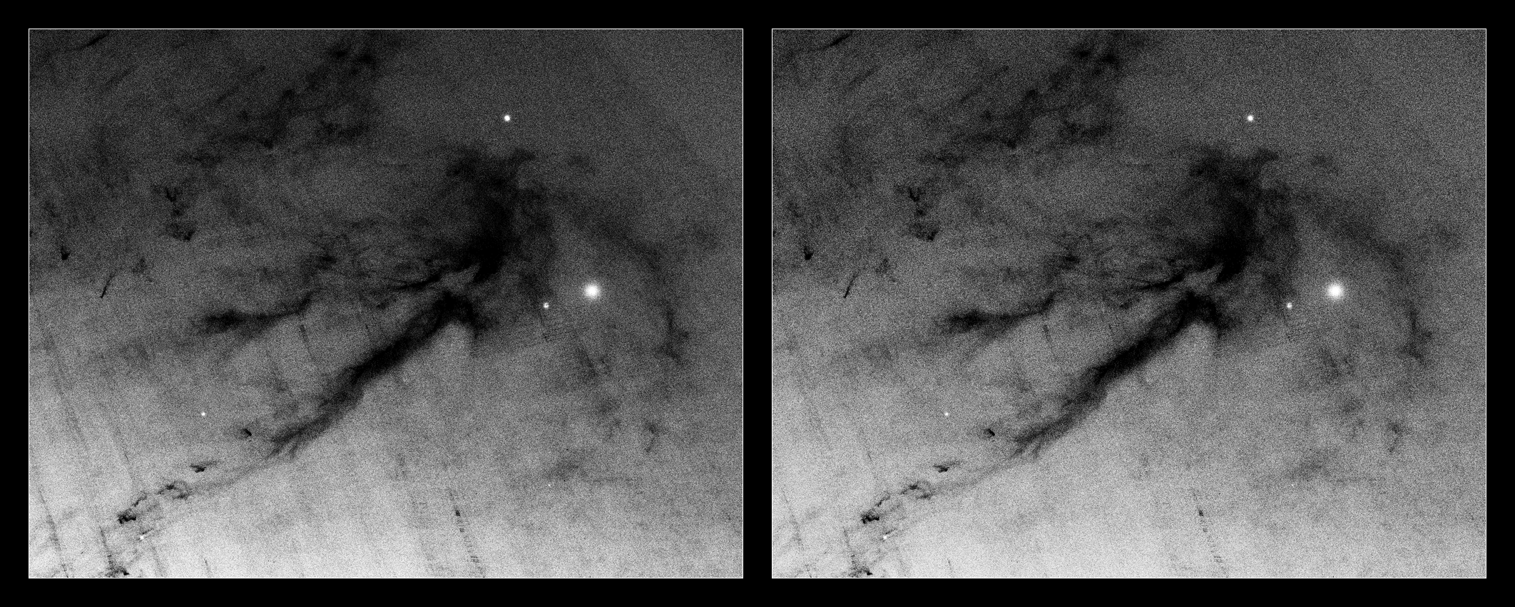Five bright stellar clusters stand out in both views: the brightest one, towards the right of the frame, is the globular cluster M4.