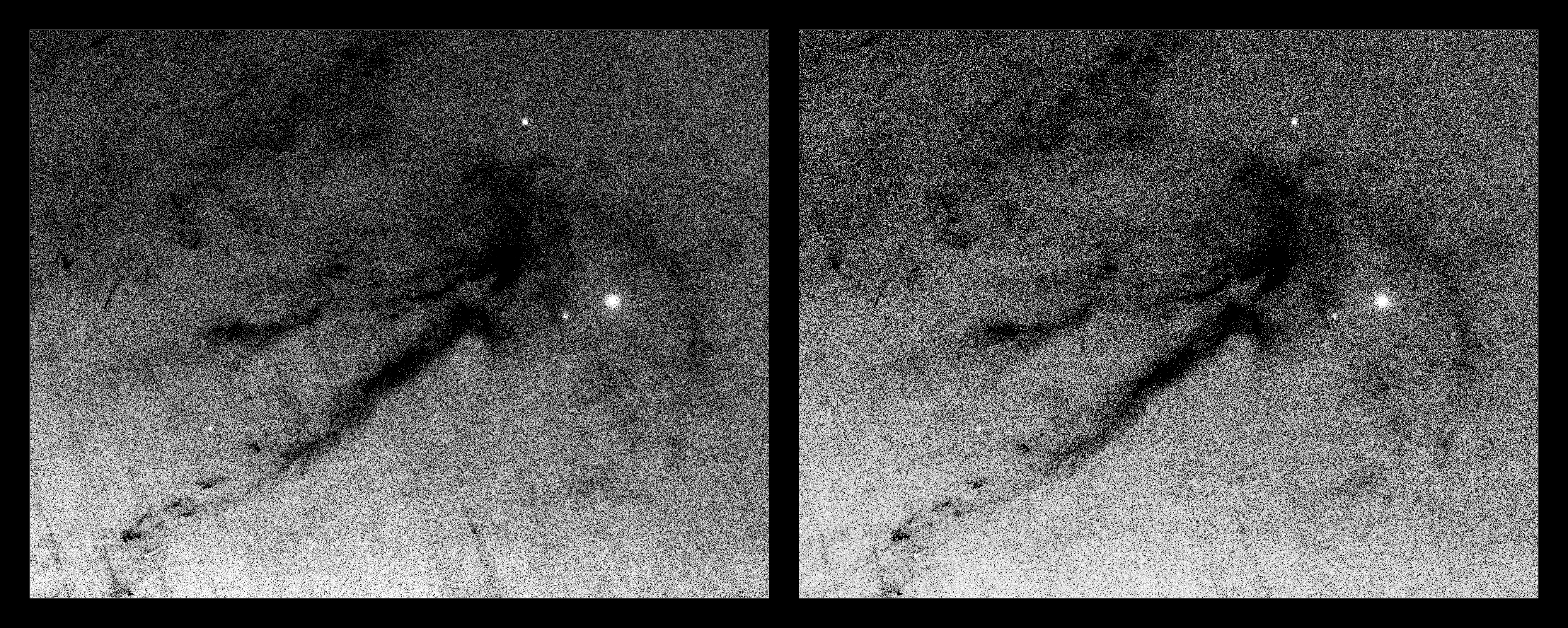 On the left, the image based on the stellar density shows the distribution of all stars in the area, and clearly outlines the silhouette of dark clouds of gas and dust hiding background stars from view. On the right, the image based on the total flux is dominated by the brightest, most massive stars; in some spots, these stars outshine their less bright, lower-mass counterparts.
