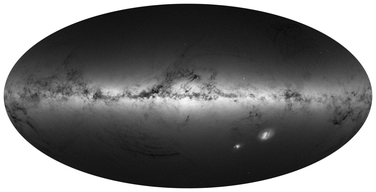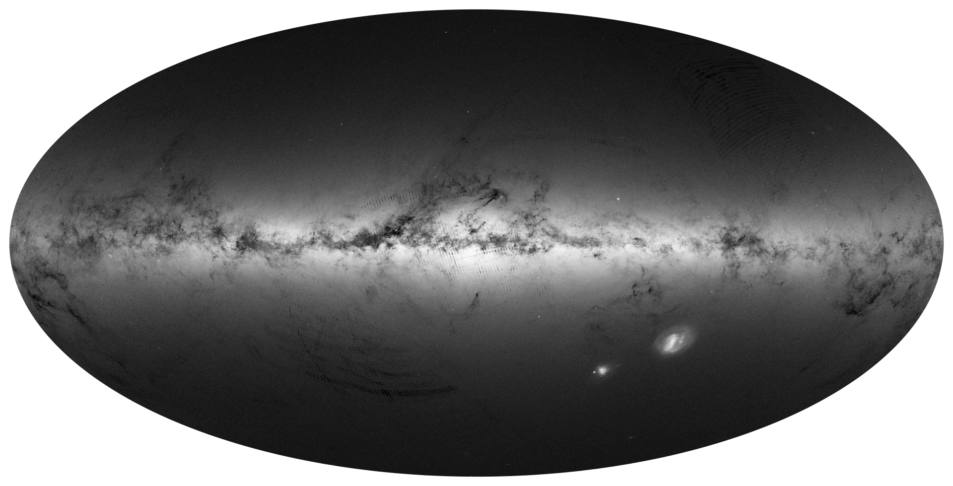 The artefacts reflecting Gaia's scanning procedure that stand out in the all-sky map based on stellar density from the mission's first data release are less prominent in this view; these patterns are caused by the not yet uniform coverage of the sky at the time, and as such they most affect the faintest stars in the survey.