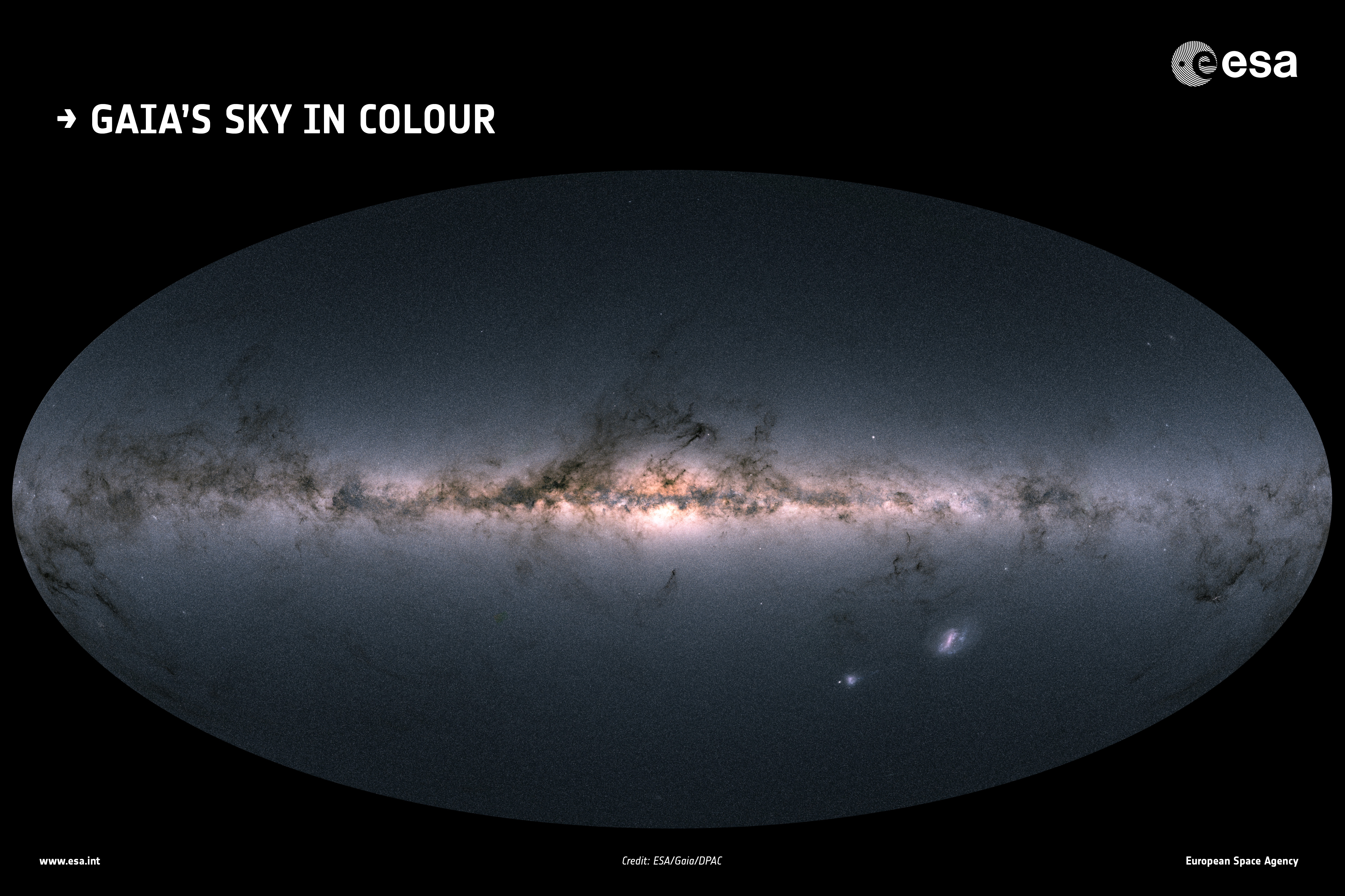 Gaia's all-sky view of our Milky Way Galaxy and neighbouring galaxies, based on measurements of nearly 1.7 billion stars. The map shows the total brightness and colour of stars observed by the ESA satellite in each portion of the sky between July 2014 and May 2016.