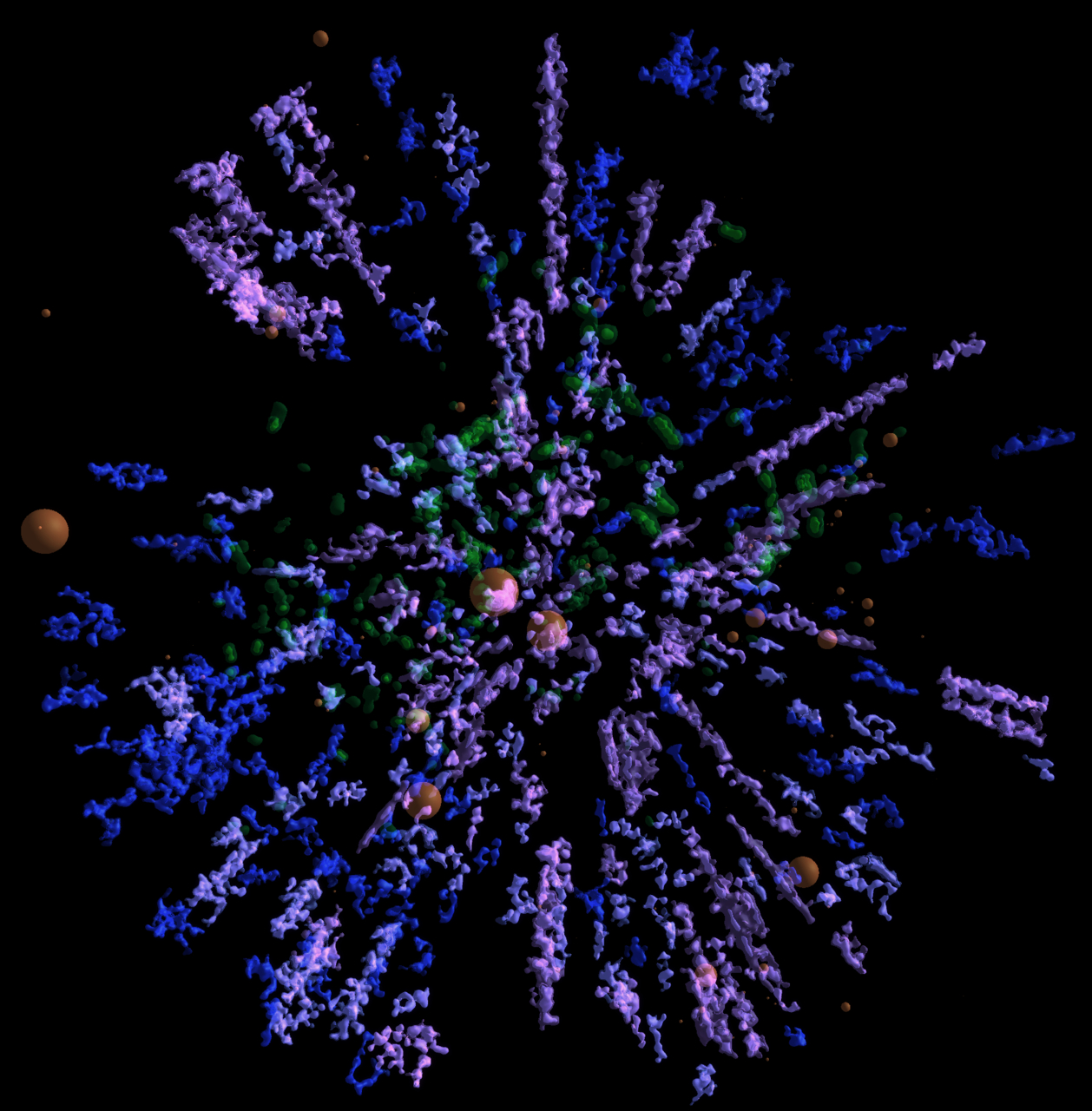 To deal with the massive number of stars in the Gaia catalogue, Kevin made use of so-called density isosurfaces, a technique that is routinely used in many practical applications, for example to visualise the tissue of organs of bones in CT scans of the human body. In this technique, the 3D distribution of individual points is represented in terms of one or more smooth surfaces that delimit regions with a different density of points.
