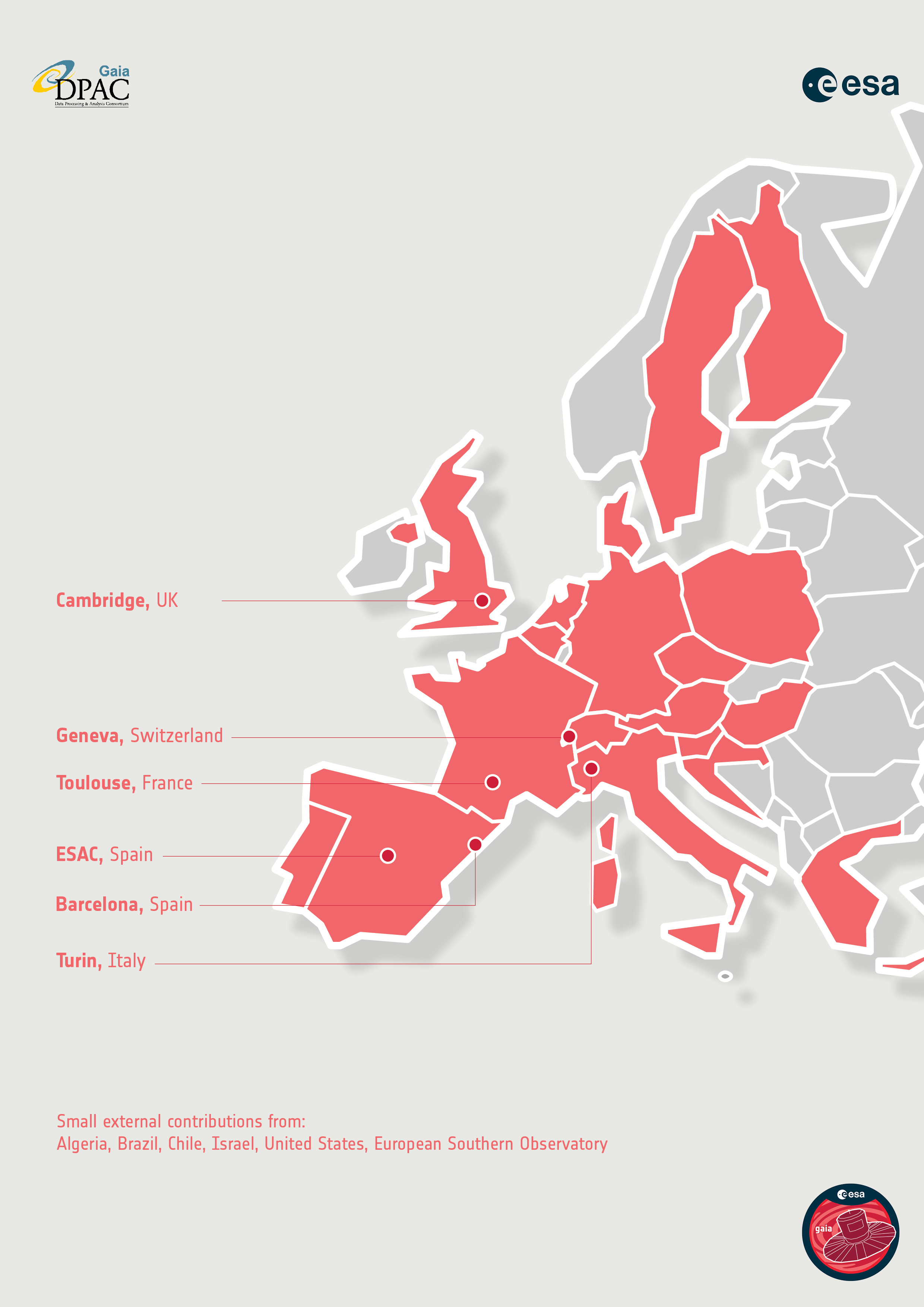 Expert scientists and software developers from across Europe are teamed up in the Gaia Data Processing and Analysis Consortium (DPAC). DPAC is responsible for processing and analysing Gaia's data, and producing the Gaia Catalogues. With members from more than 20 countries, the consortium brings together skills and expertise from across the continent, reflecting the international nature and cooperative spirit of ESA itself.