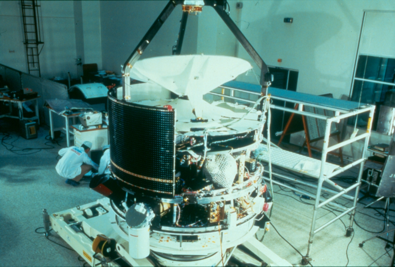 Giotto spacecraft half enclosed by the solar cell array. Shown on the experiment platform from left to right: starmapper, camera, checkout panel, PICCA of the RPA experiment (white, looking down), EESA of the RPA experiment (white with a red cap), PIA (black, only a small part shown).