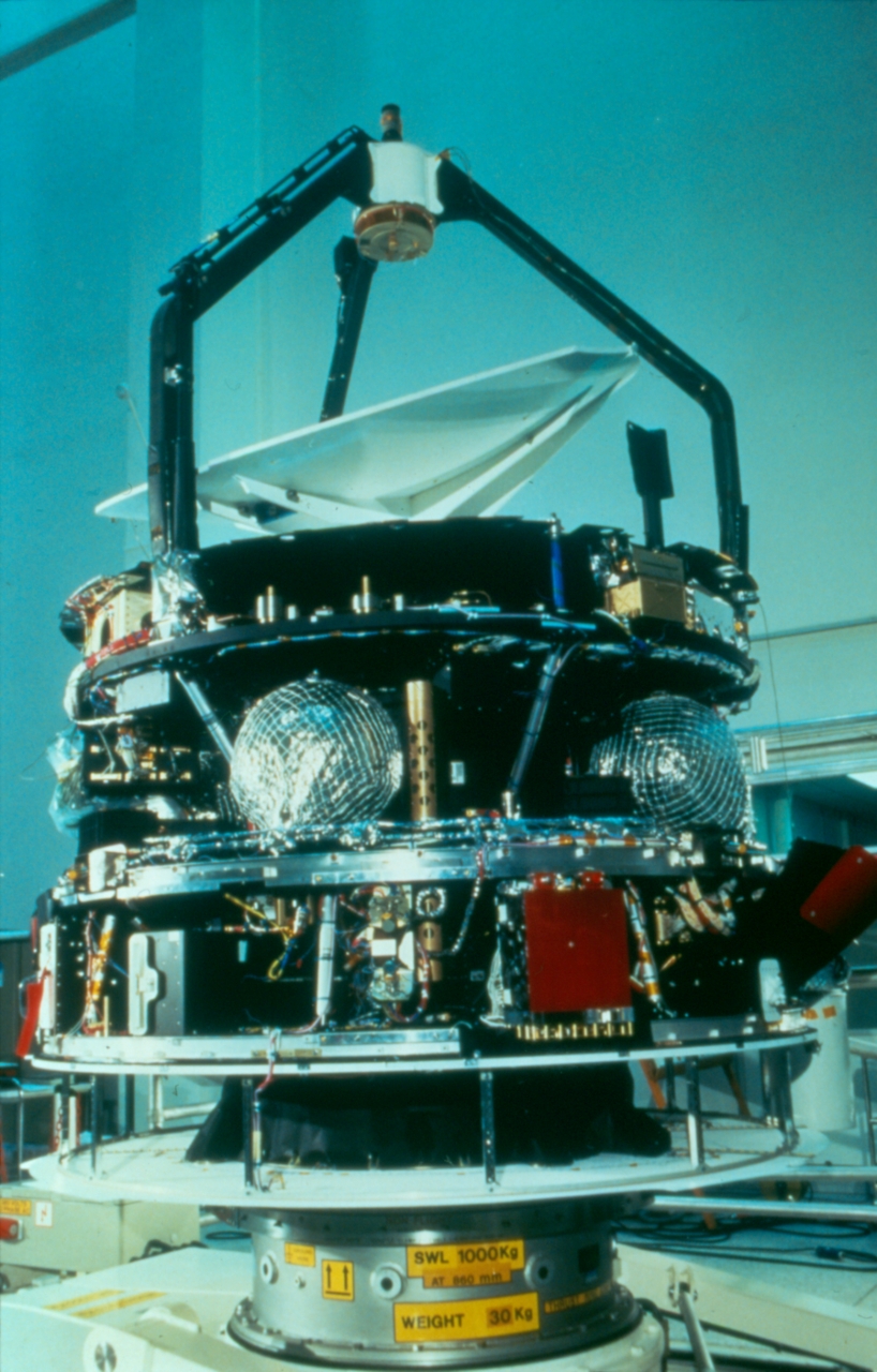 Giotto spacecraft during integration in the Intespace facility in Toulouse, Shown on the experiment platform from right to left: camera (white, looking down), star mapper (red, looking up), EPA with its three very small telescopes, NMS (red plate), two hydrazine jets used for orbit and attitude control, liS of the JPA experiment and on the left edge HERS of the IMS experiment. The silver spheres on the main platform are two of the four hydrazine tanks.