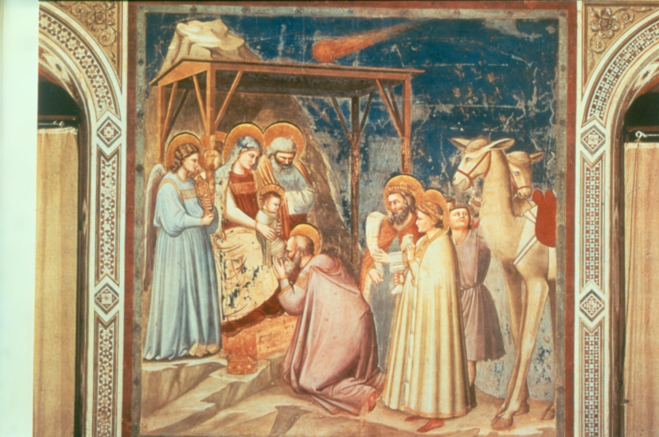 'Adoration of the Magi', one scene in a fresco cycle, painted by the Florentine master Giotto di Bondone. The cycle decorates the interior of the Scrovegnichapel in Padua and was probably begun in 1303. Halley's Comet appeared in 1301 and served as a model for Giotto's 'Star of Bethlehem'. ESA named its mission to Halley's Comet 'Giotto' in recognition of the fact that Giotto di Bondone made the first 'scientific' drawing of the comet recorded in history.