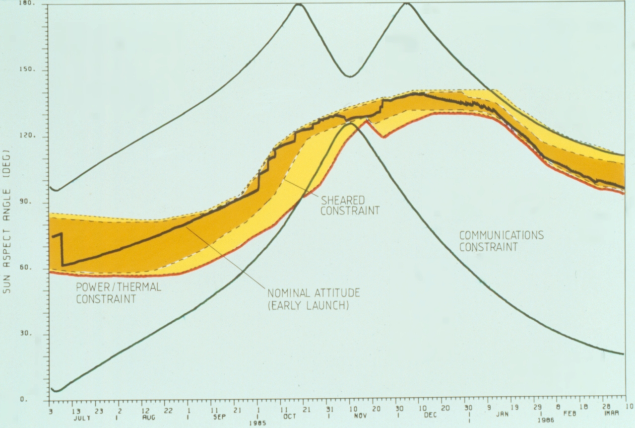 This is slide 15 of 20 from the first Giotto slide set. The following caption is the one originally provided with the slide set. Throughout the mission the spacecraft attitude defined by the Sun aspect angle (0° -Sun above the tripod) must be kept inside an allowed corridor (light yellow) which is given by two constraints: The high gain antenna must permanently point at the Earth to maintain the telecommunications link (communications constraint, green line), and, secondly, the spacecraft must generate enough power without being heated up too much (thermal/power constraint, red line).