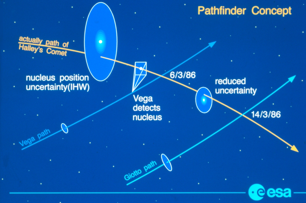 About 2 days before the encounter a final decision will have to be made where to target the Giotto spacecraft. Unfortunately, the position of the comet nucleus can only be estimated because the nucleus is disguised by the coma dust and gas. Based on observations from the Earth the nucleus position is known with an accuracy of 500 km (1Ã). If the spacecraft is targeted at 500 km the actual flyby distance could be anywhere between 0 and 1000 km or more. This is not a very satisfactory situation.