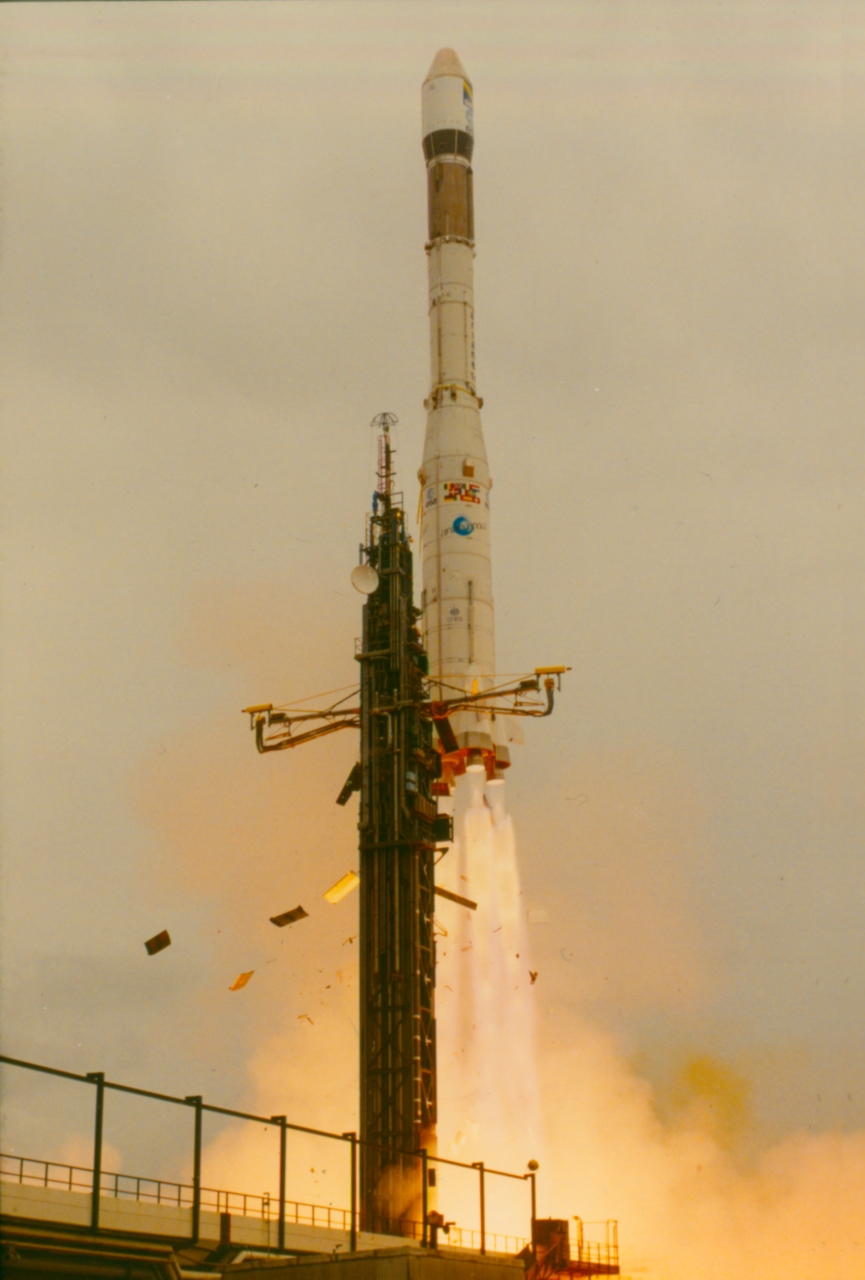 Lift off of Ariane flight 14 carrying Giot- to at 11hrs 23 mins UTC on 2 July 1985. The launch was accomplished on the first day of the official launch window from the European launch facility at Kourou, French Guyana. Ariane-1 was the first of the European launches series and generates 245 000 kg of thrust from its four Viking V engines at lift-off. A mission originally planned to last only eight months finally became a seven year 'Odyssey' with an unprecedented encounter with two comets.