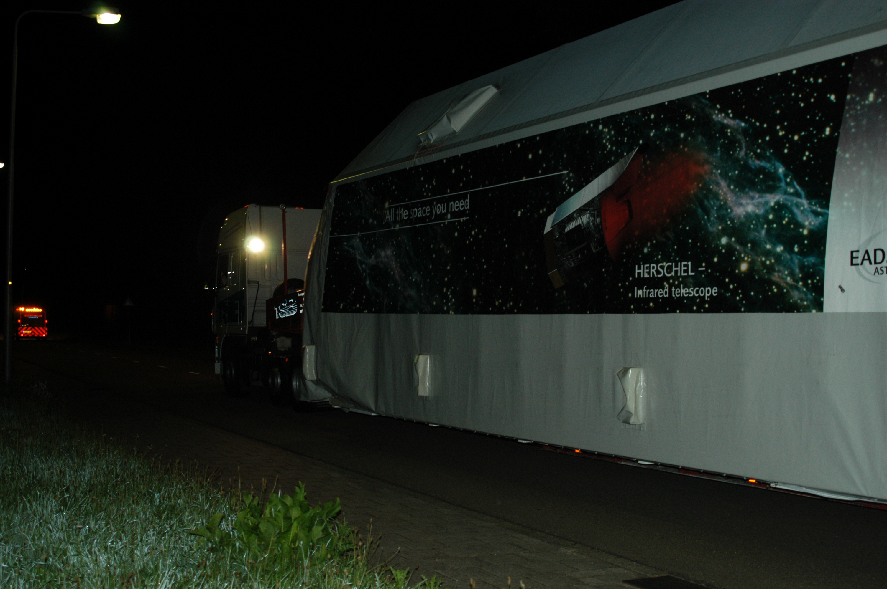 The Herschel Payload Module arrives at ESTEC after a short journey across Germany and Holland.