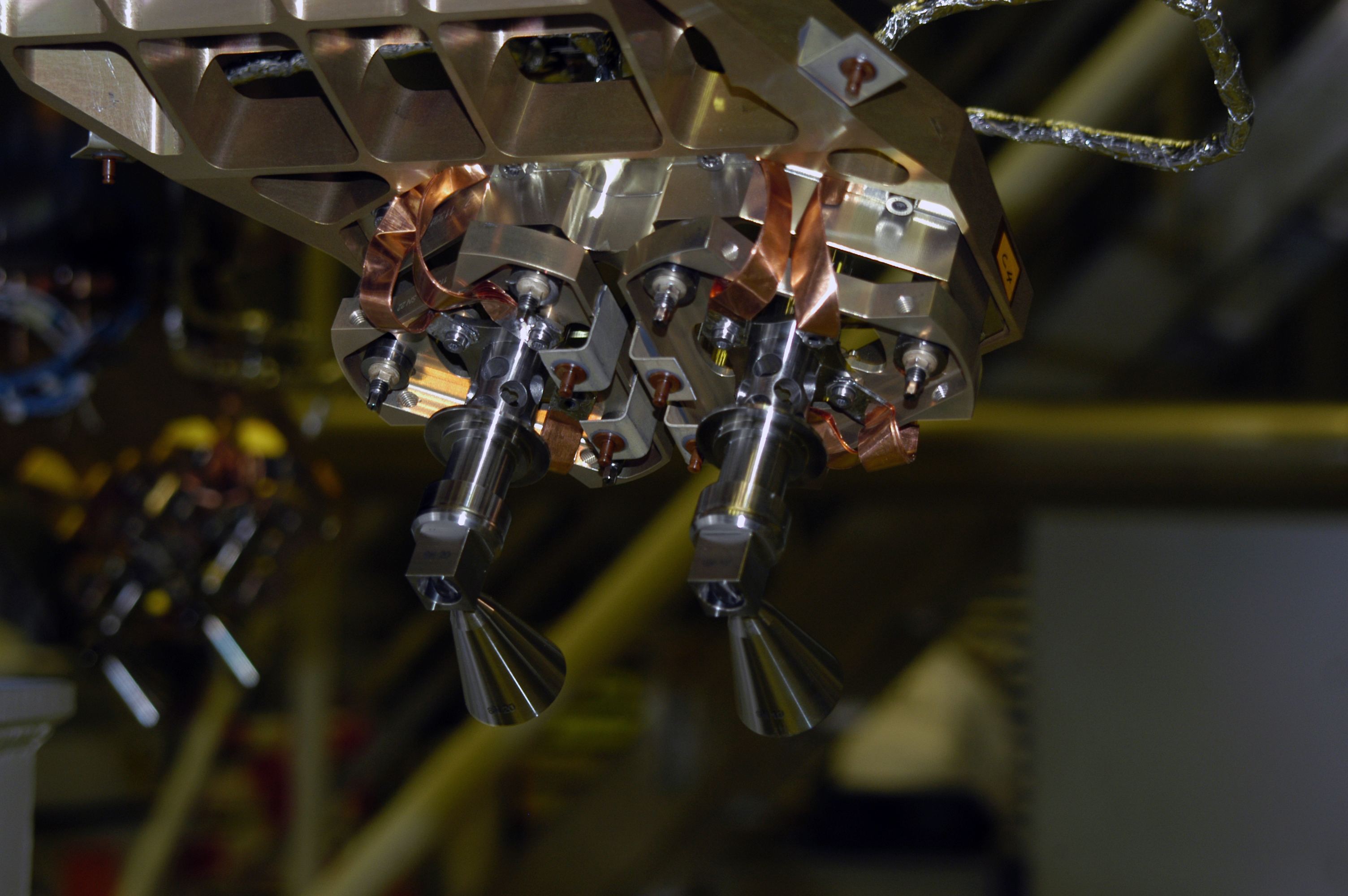 Close-up of one of the 6 thruster assemblies, each assembly consists of two 20-N thrusters and their alignment adjustment brackets. Four assemblies are used to provide torques for attitude control while two are used to provide forces for orbit control.