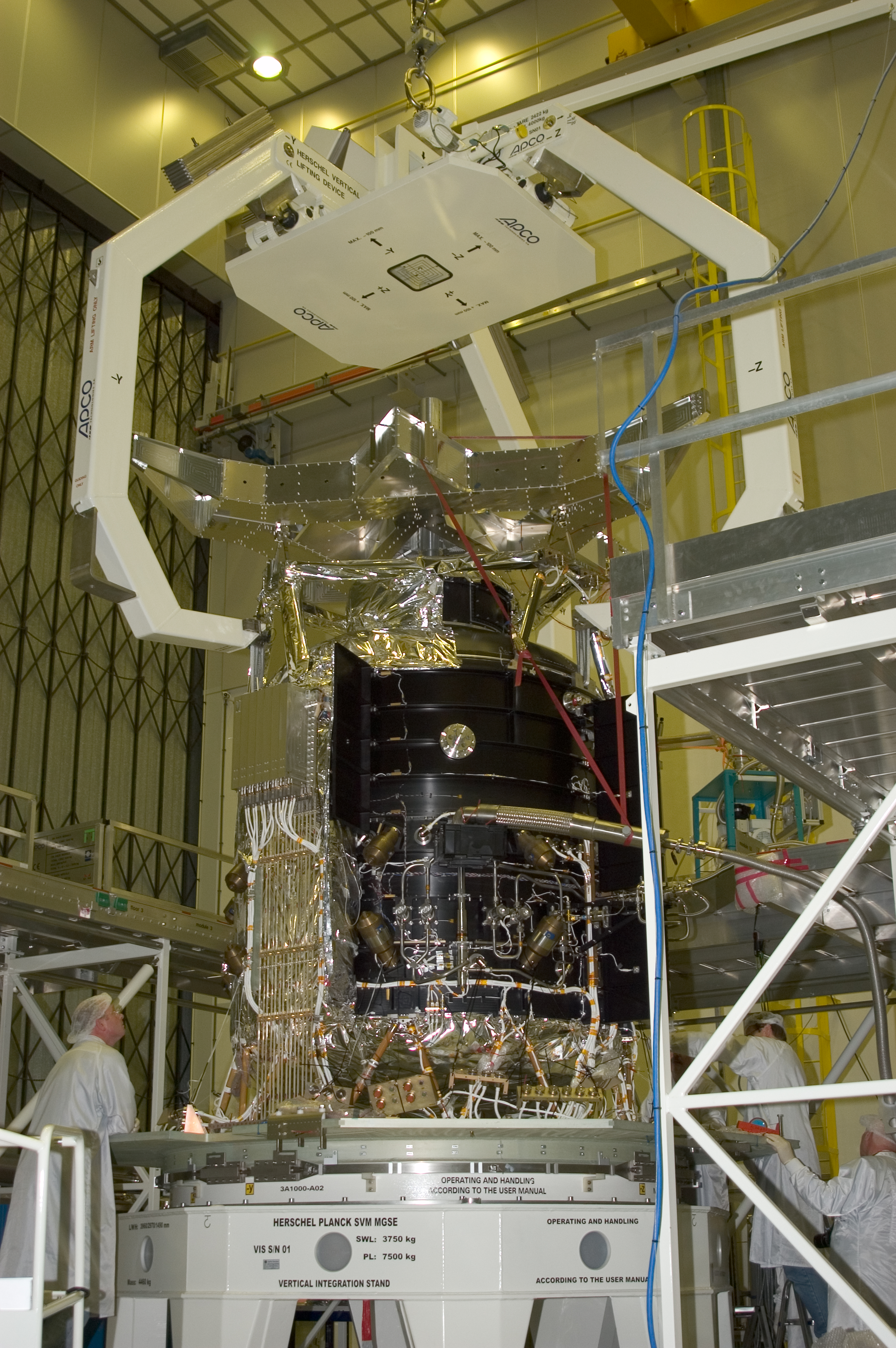 Payload module on its own adapter with the sophisticated lifting device already installed. The special three armed hook device is designed to lift the complete spacecraft even after the 3.5m diameter primary mirror has been installed.