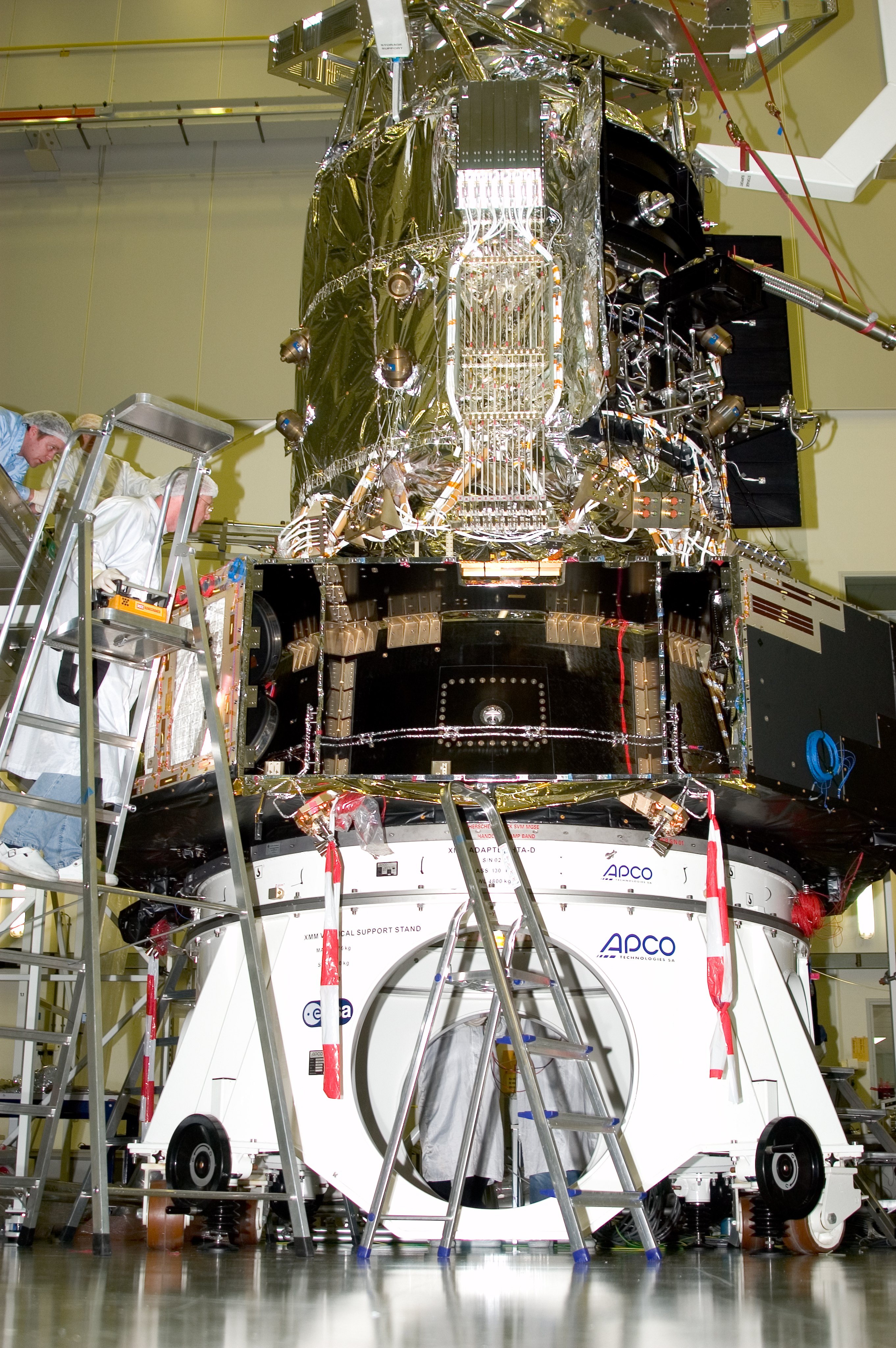 Payload module is slowly lowered onto the service module for mating to allow further tests of the integrated structural and thermal qualification models.