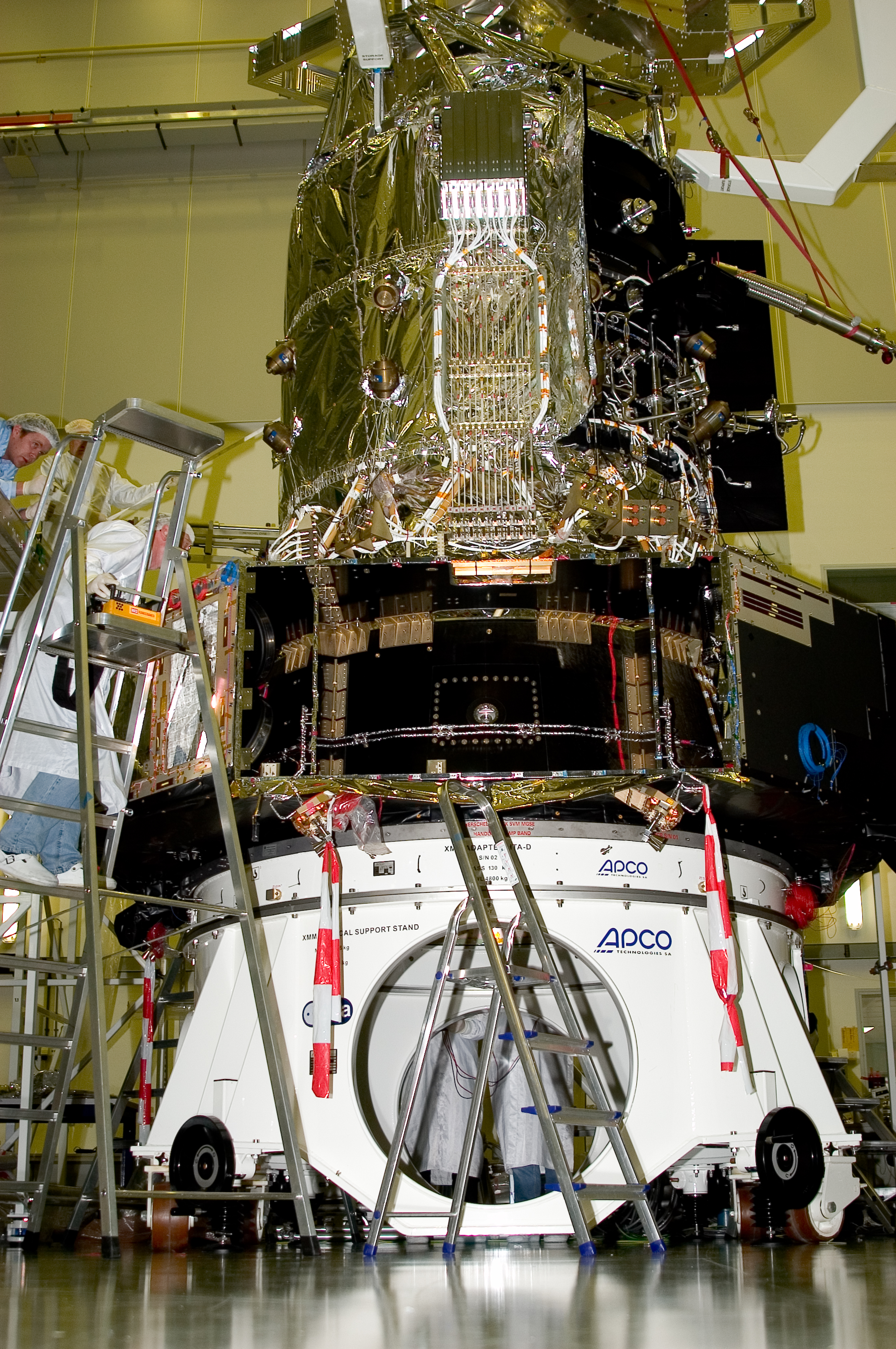 Payload module is slowly lowered onto the service module for mating to allow further tests of the integrated structural and thermal qualification models.