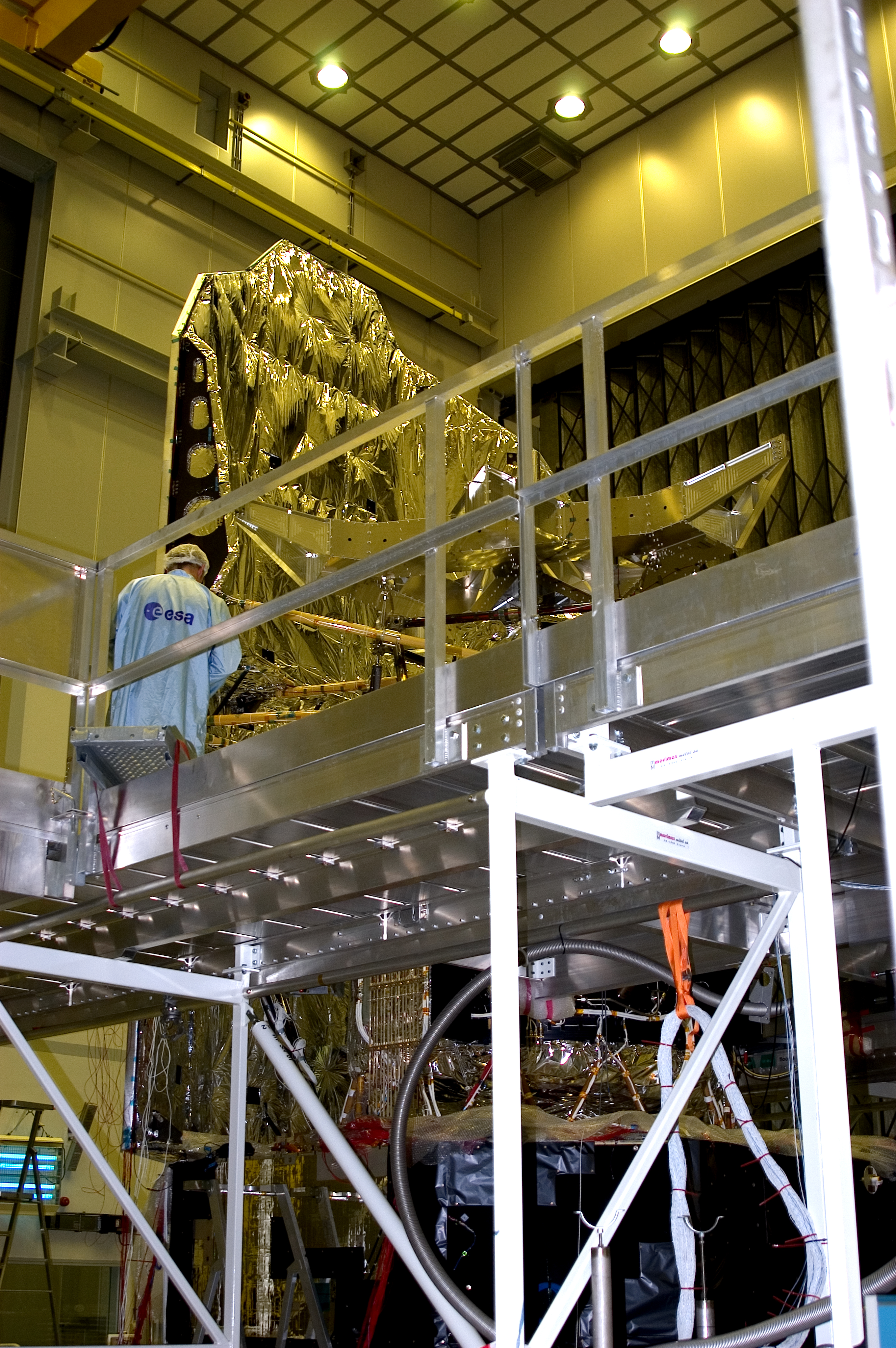 Installation of the Herschel Sunshield/Sunshade onto the Herschel satellite (Structure Model) in preparation for a series of mechanical tests.