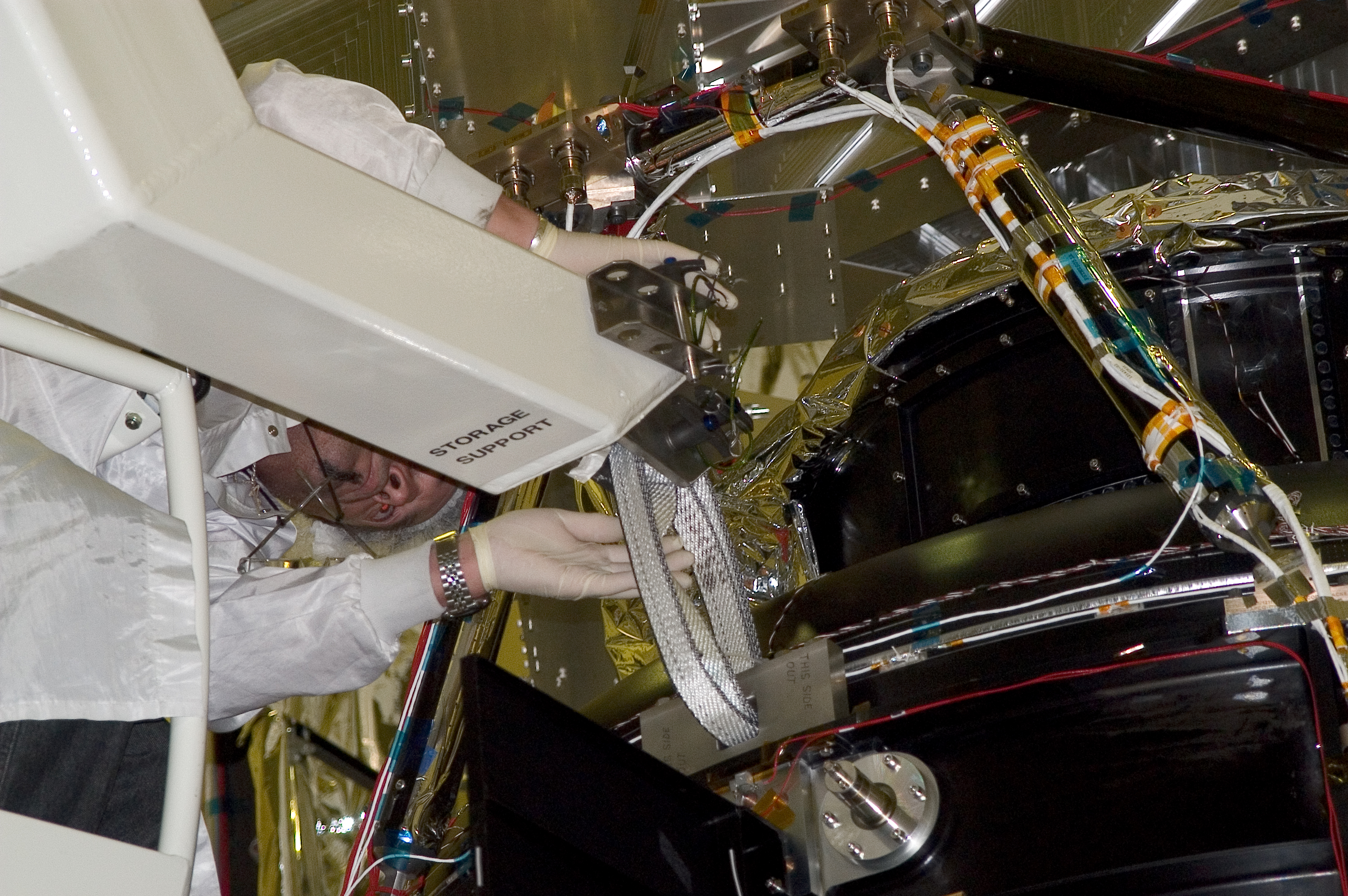 The Herschel spacecraft during its transfer from the Vertical Support Stand onto the HYDRA shaker table. One of the lifting device's three lifting straps is being connected to the spacecraft.