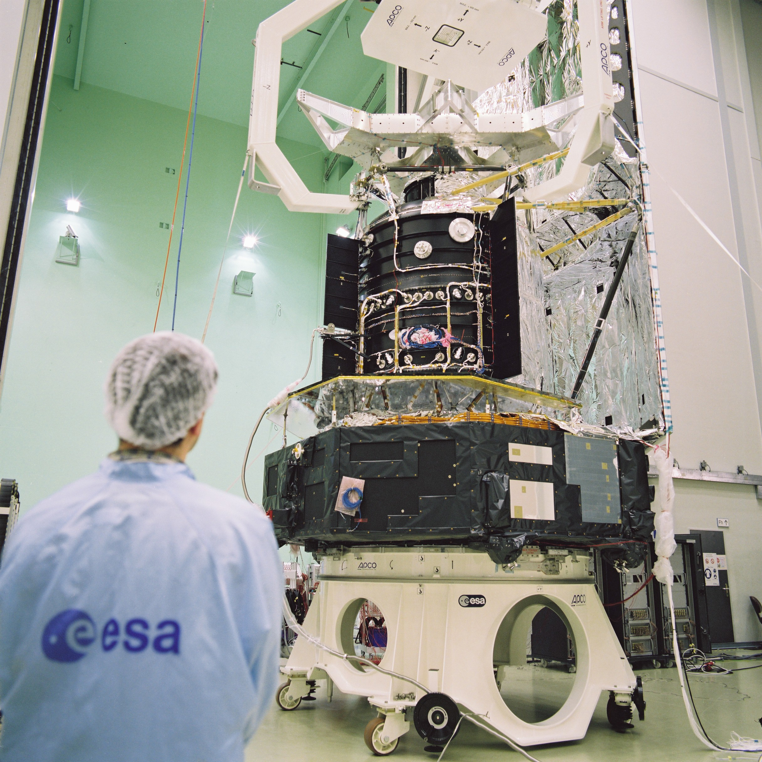 The Herschel Structural Model spacecraft is being prepared for a series of qualification tests in the acoustic test chamber, LEAF, in ESTEC.