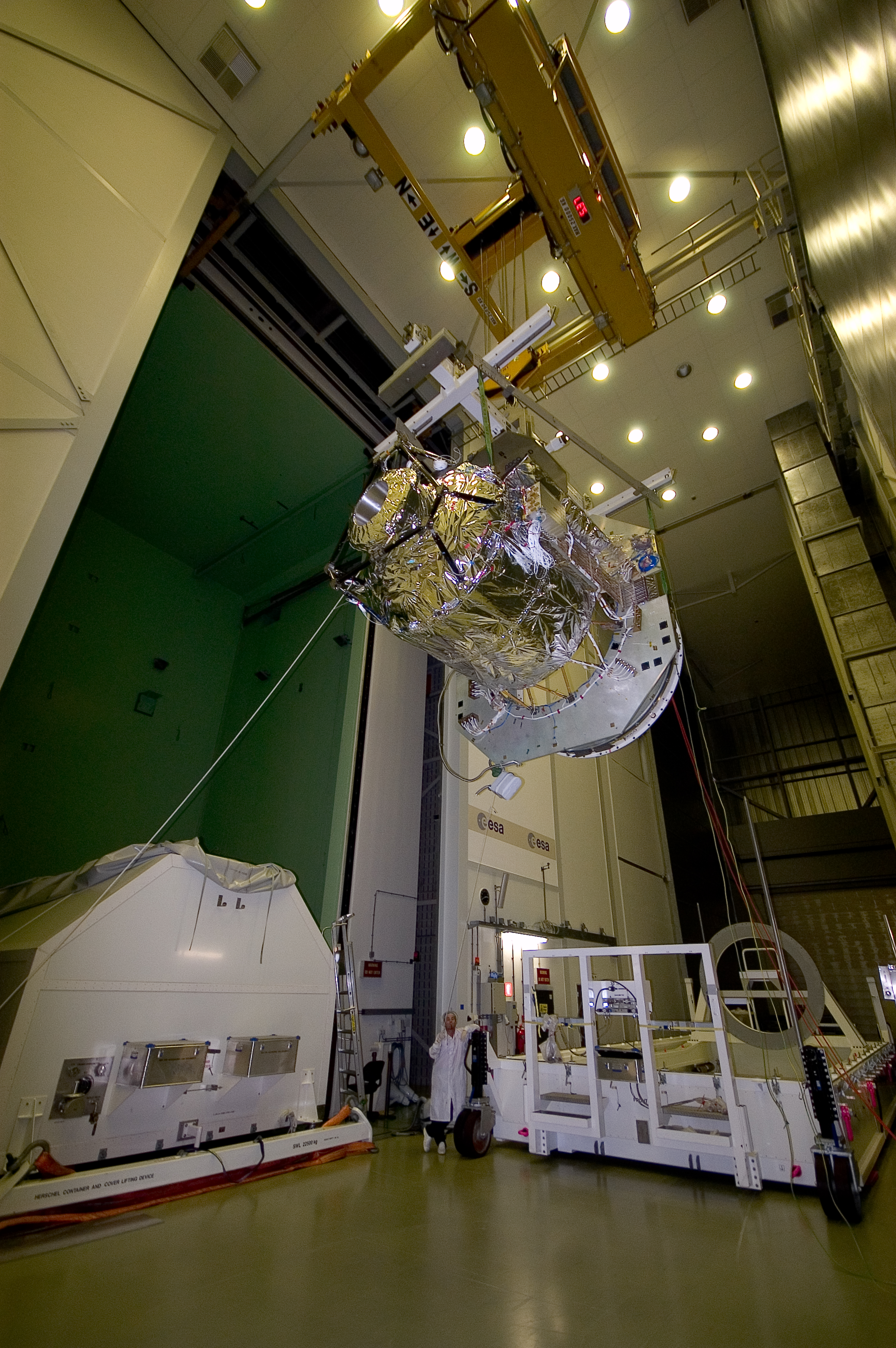 The Herschel Cryostat during loading into its satellite transport container, in preparation for a complicated 5-day transport through Europe back to Friedrichshafen, Germany.