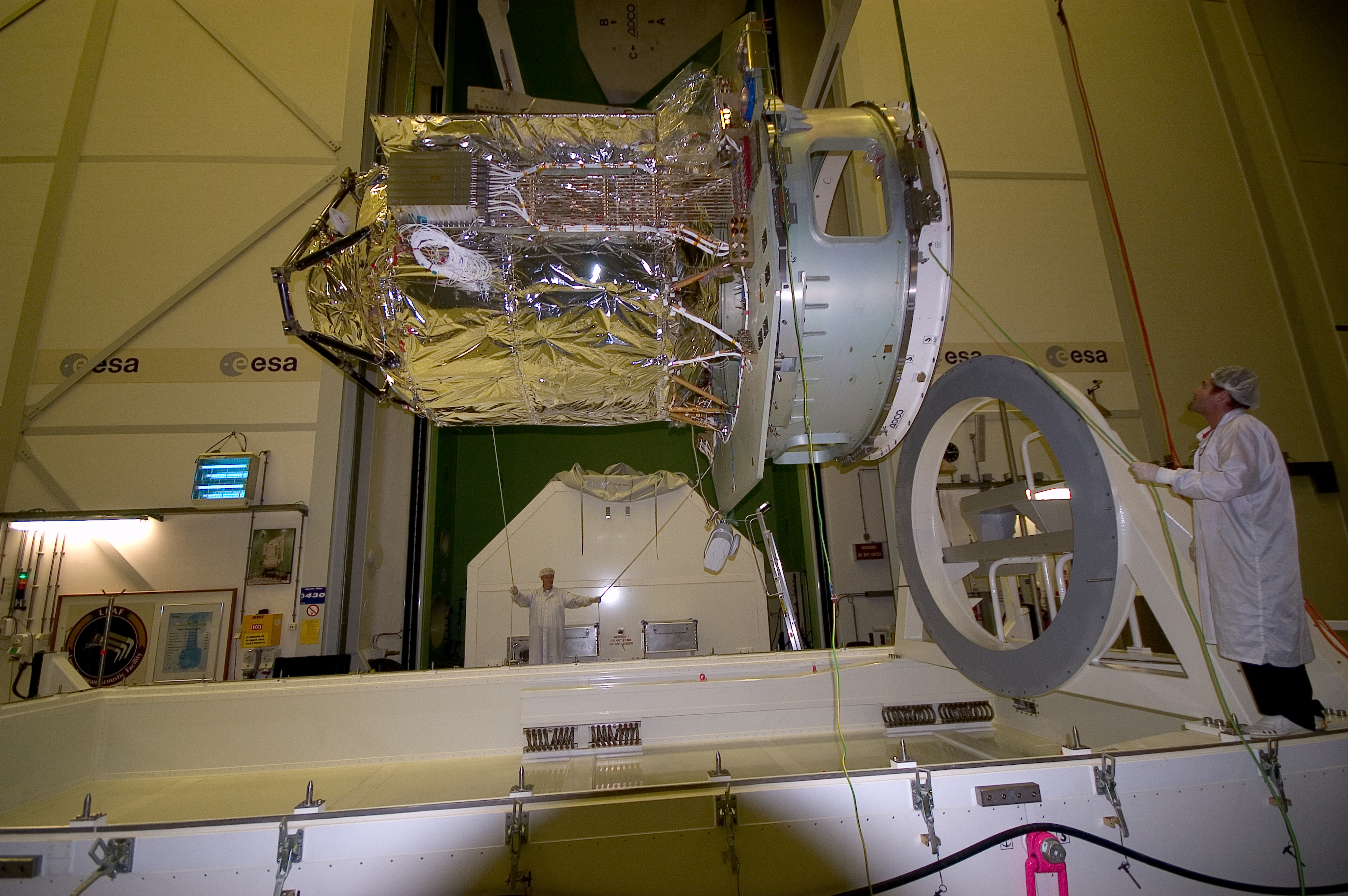 The Herschel Cryostat during loading into its satellite transport container, in preparation for a complicated 5-day transport through Europe back to Friedrichshafen, Germany.