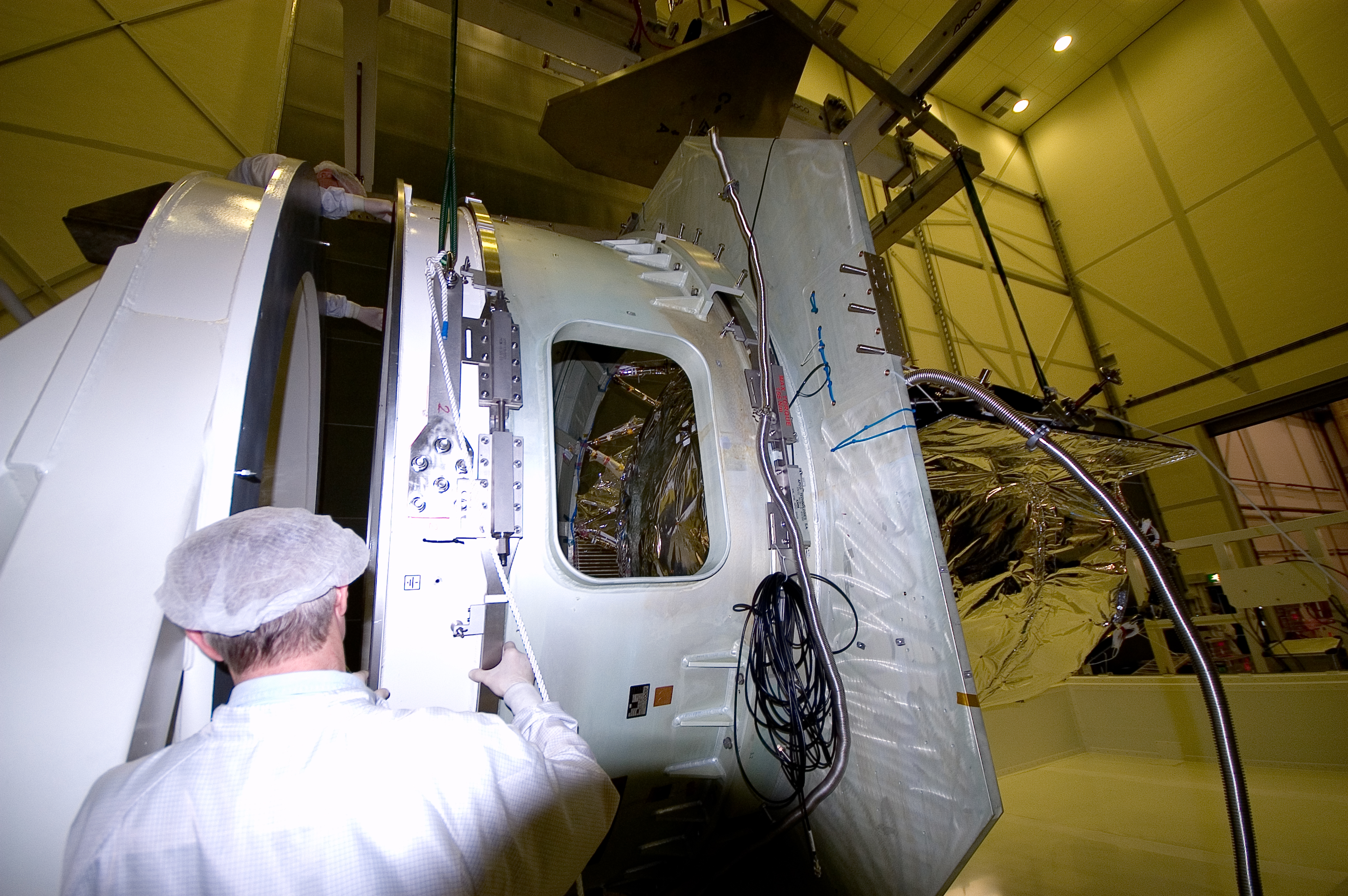 The Herschel Cryostat during loading into its satellite transport container, in preparation for a complicated 5-day transport through Europe back to Friedrichshafen, Germany.