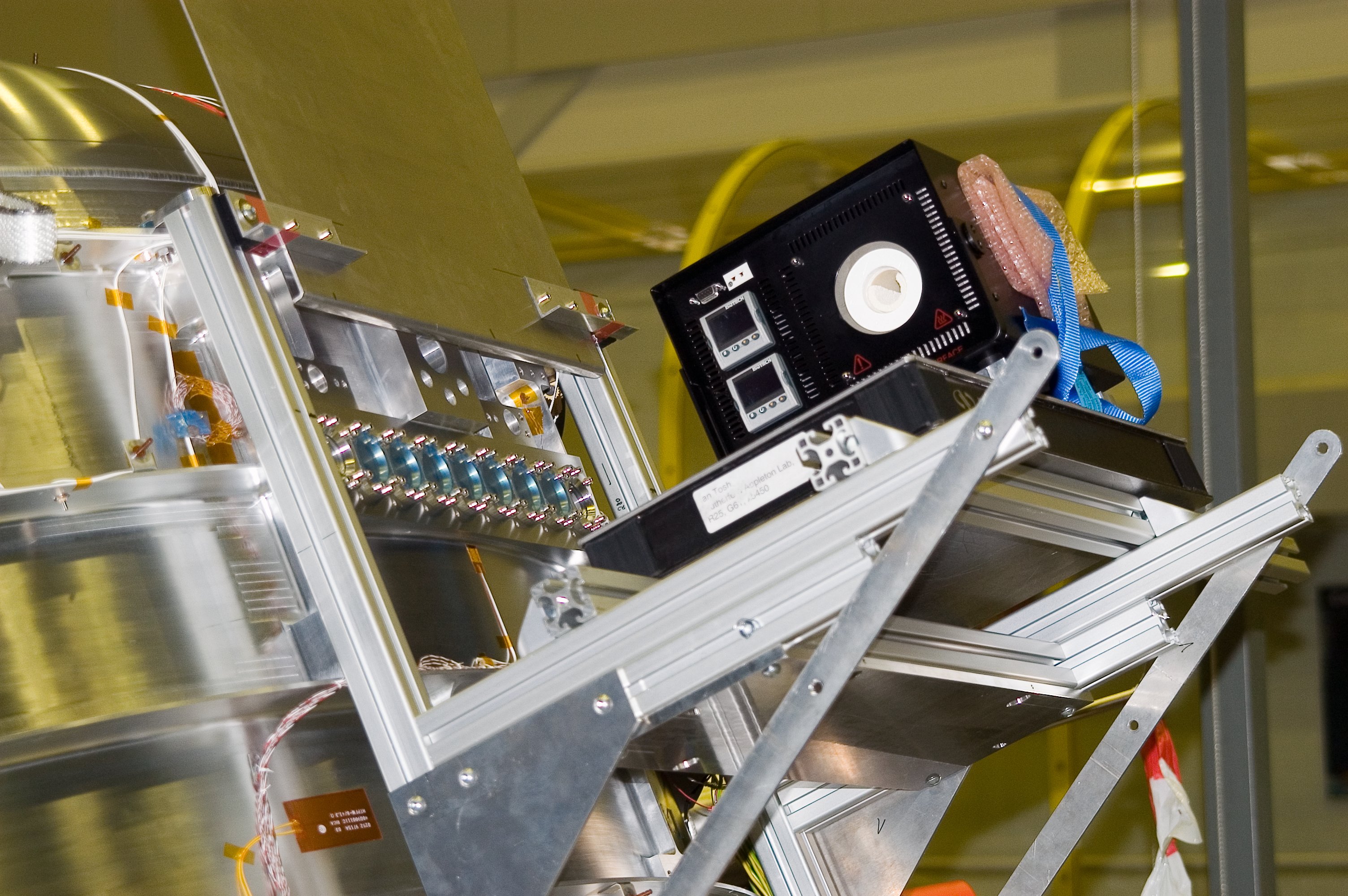 Infrared hot blackbody radiation source mounted on the Herschel cryostat for testing the level of straylight detected by SPIRE. The shutter panel is slid open, revealing the LOU windows (line of blue holes on the left).