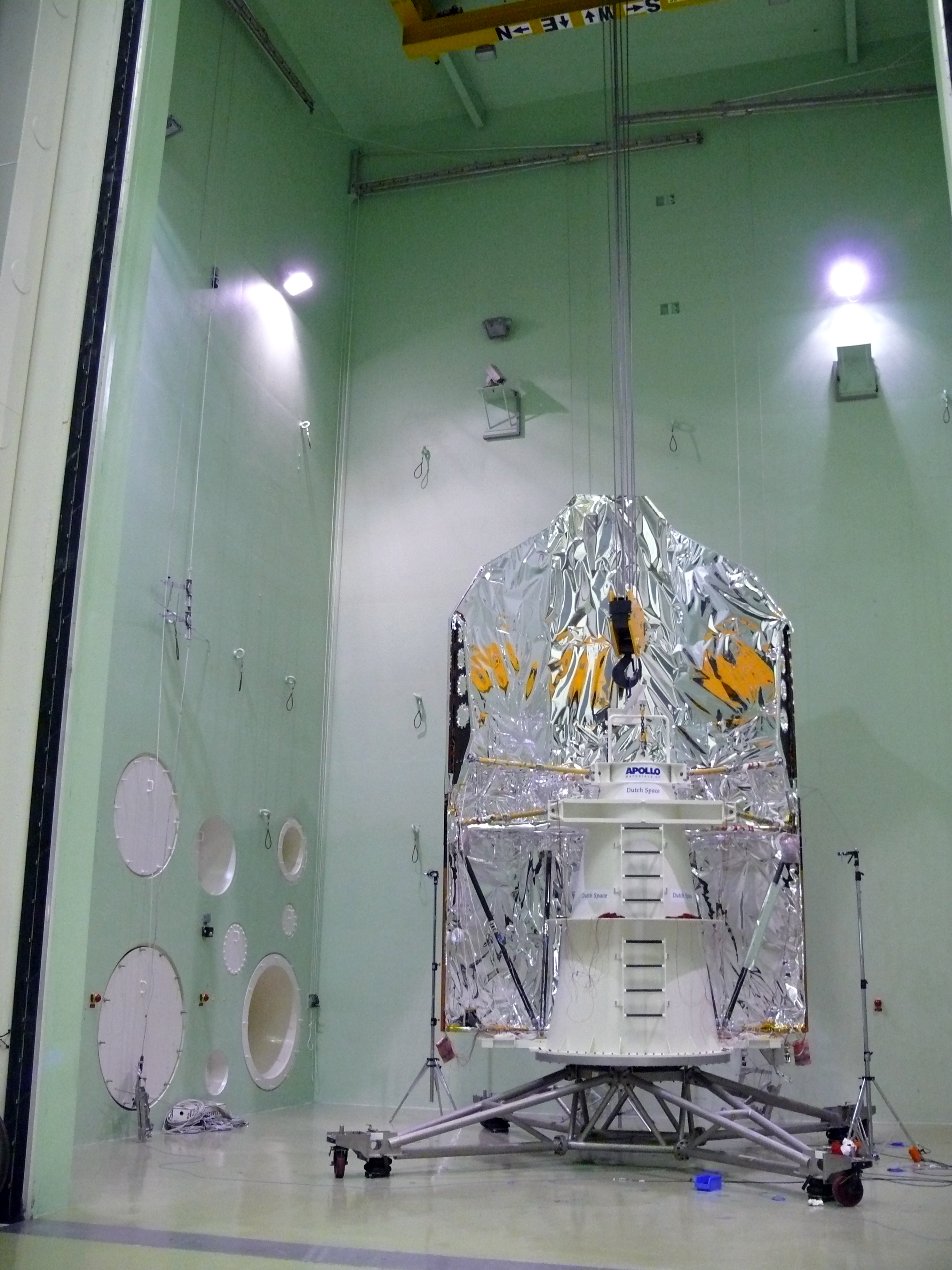 The flight model of Herschel's assembled solar array and sunshade is being installed in the Large European Acoustic Facility (LEAF) for acoustic testing.