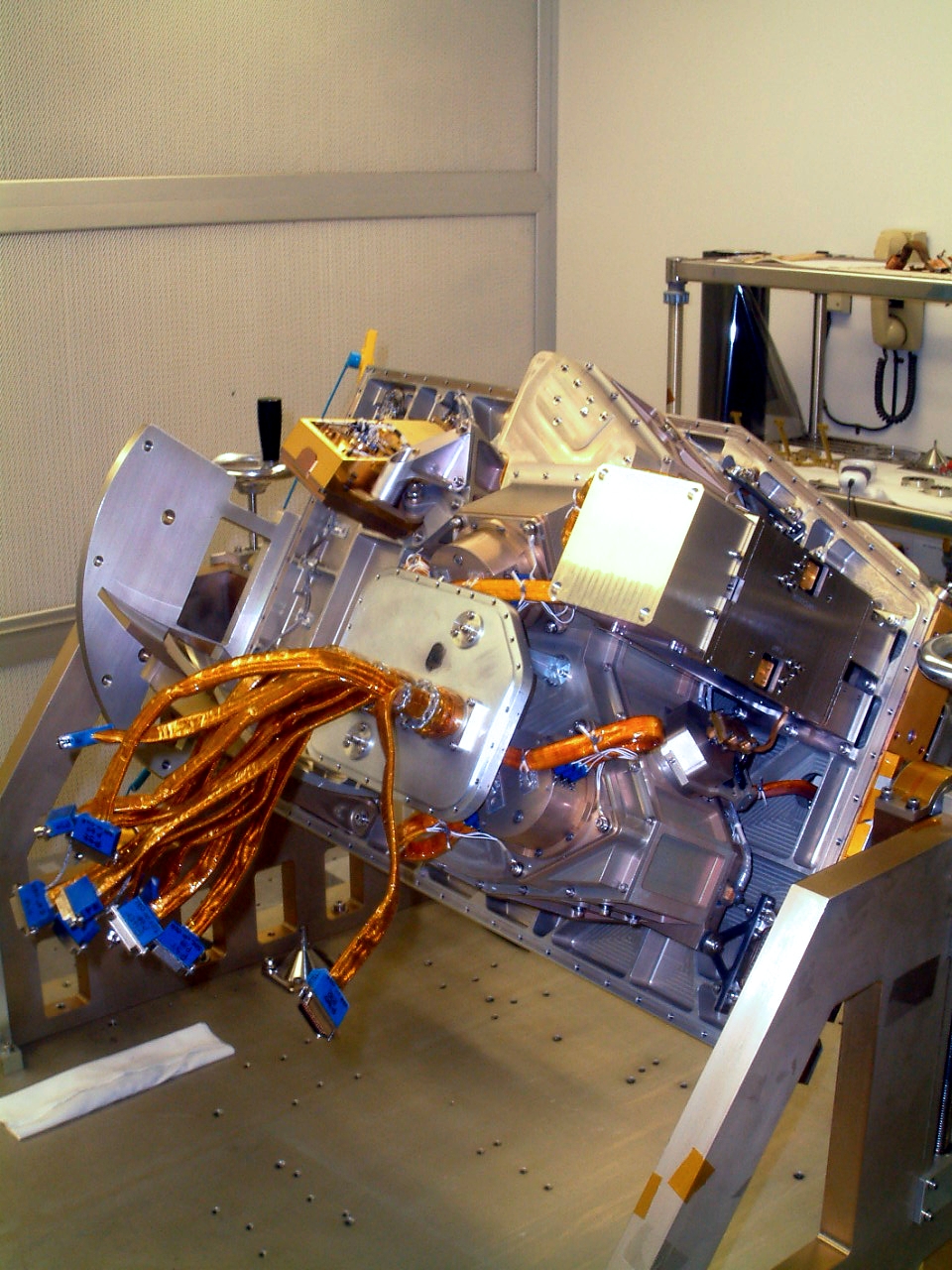 View of the SPIRE photometer's internal components. The square box at top-right is the ³He cooler that is used to maintain a temperature of 0.3K for the instrument's detectors.