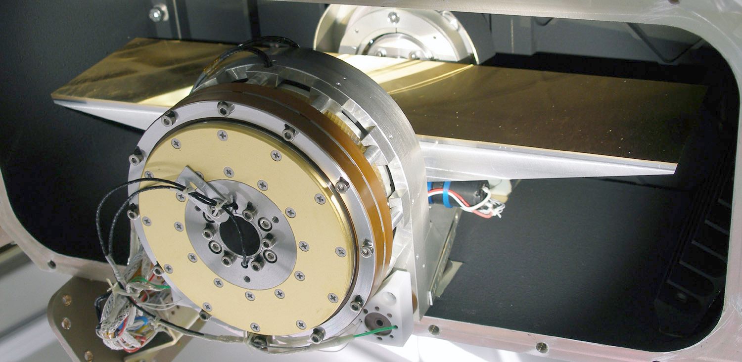 Diffraction grating of the PACS spectrometer with its cryogenic motor and position readout, which allows control of the grating angle with arcsecond precision.