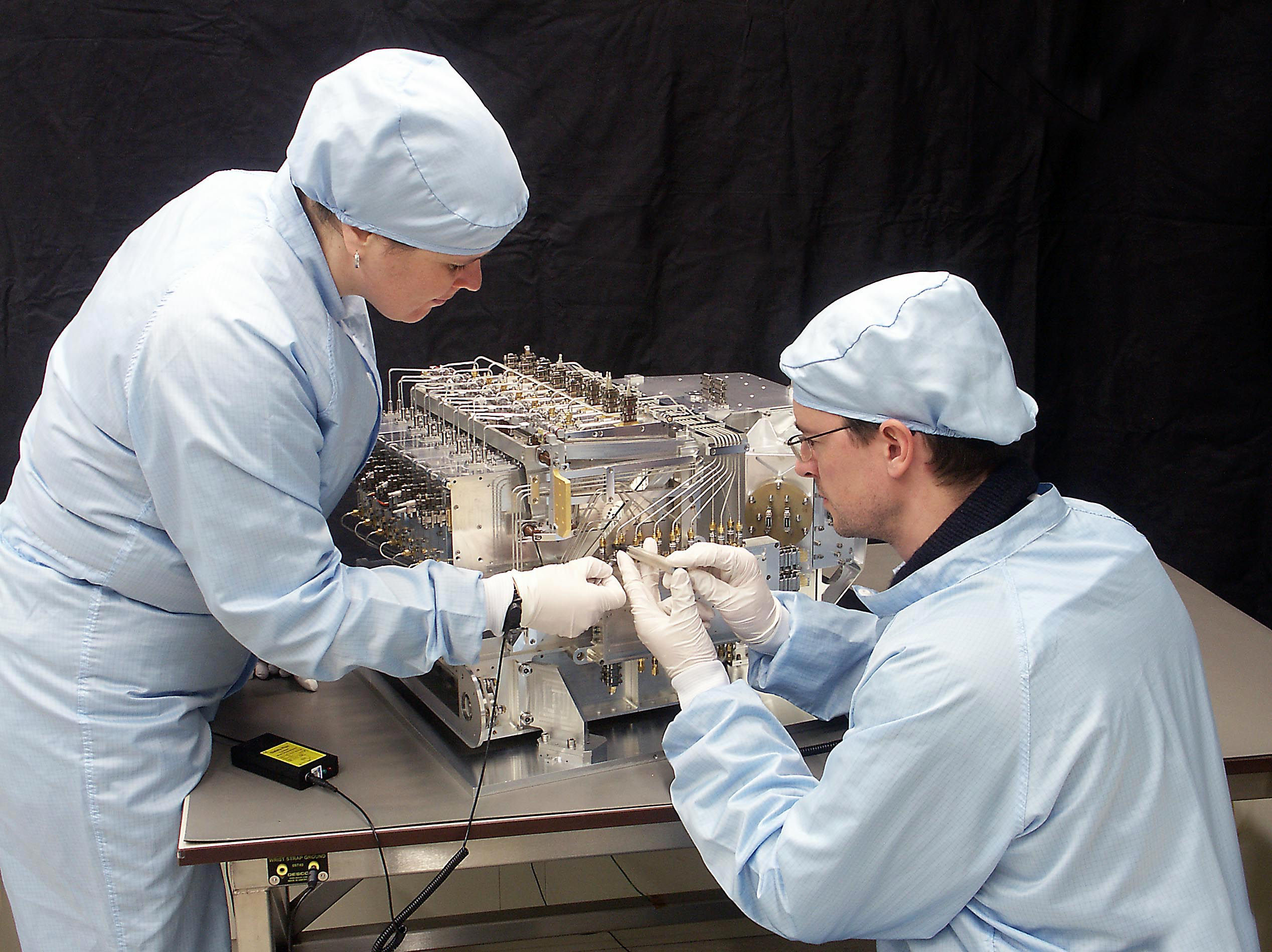 Work on the focal plane unit of HIFI in the cleanroom of SRON Netherlands Institute for Space Research.
