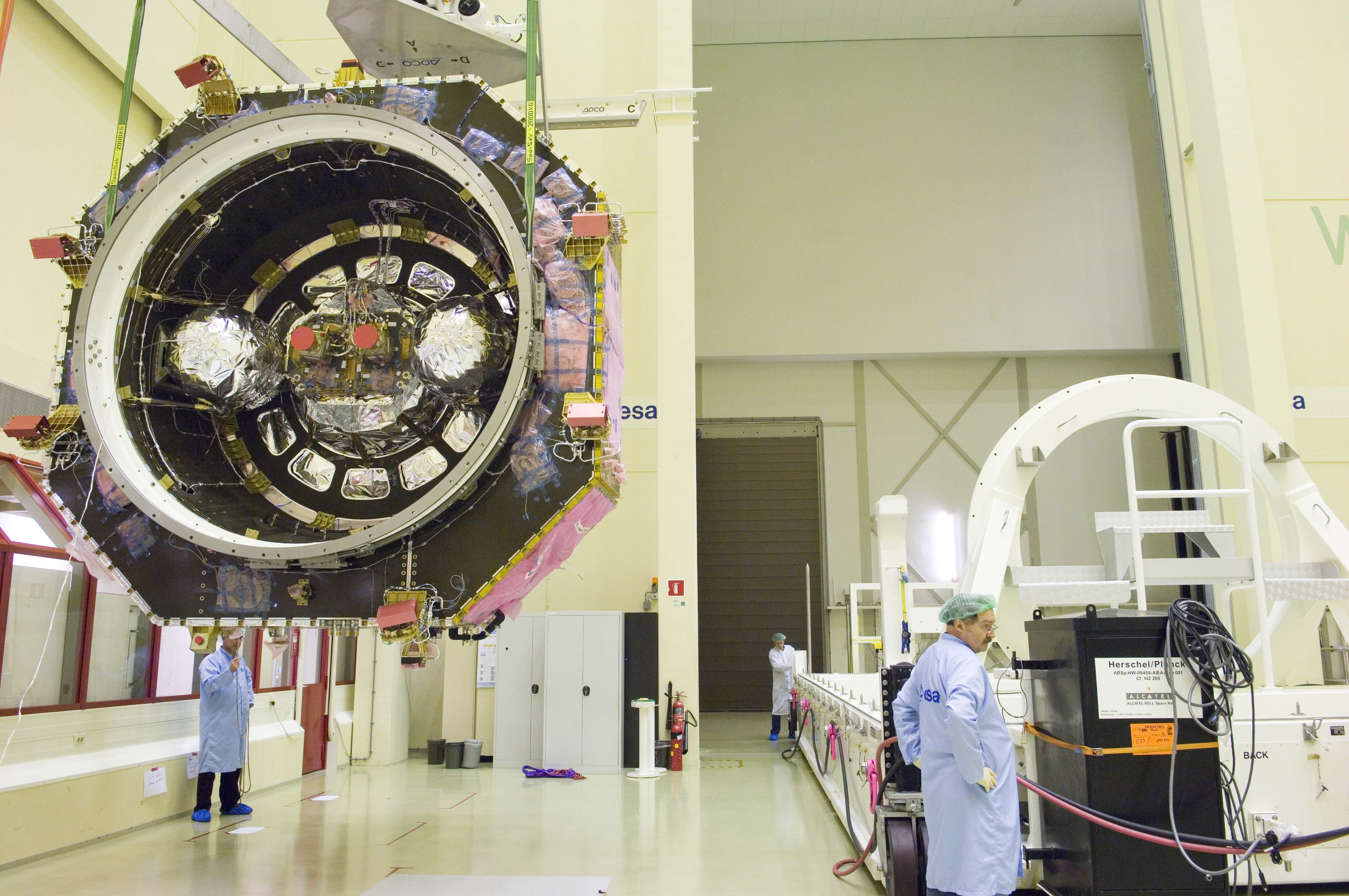 The Herschel Flight Model spacecraft hangs form a crane while its transport container is being rolled out of the room. Clearly visible is the inner part of the spacecraft's Service Module with two small helium tanks (silver spheres) and the two star trackers (at centre, with orange caps).