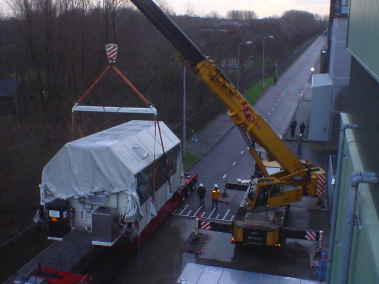 Saturday, 5 January 2008, the Herschel Flight Model spacecraft arrives at ESTEC. At the test center the spacecraft transport container is hoisted from the transporter truck.