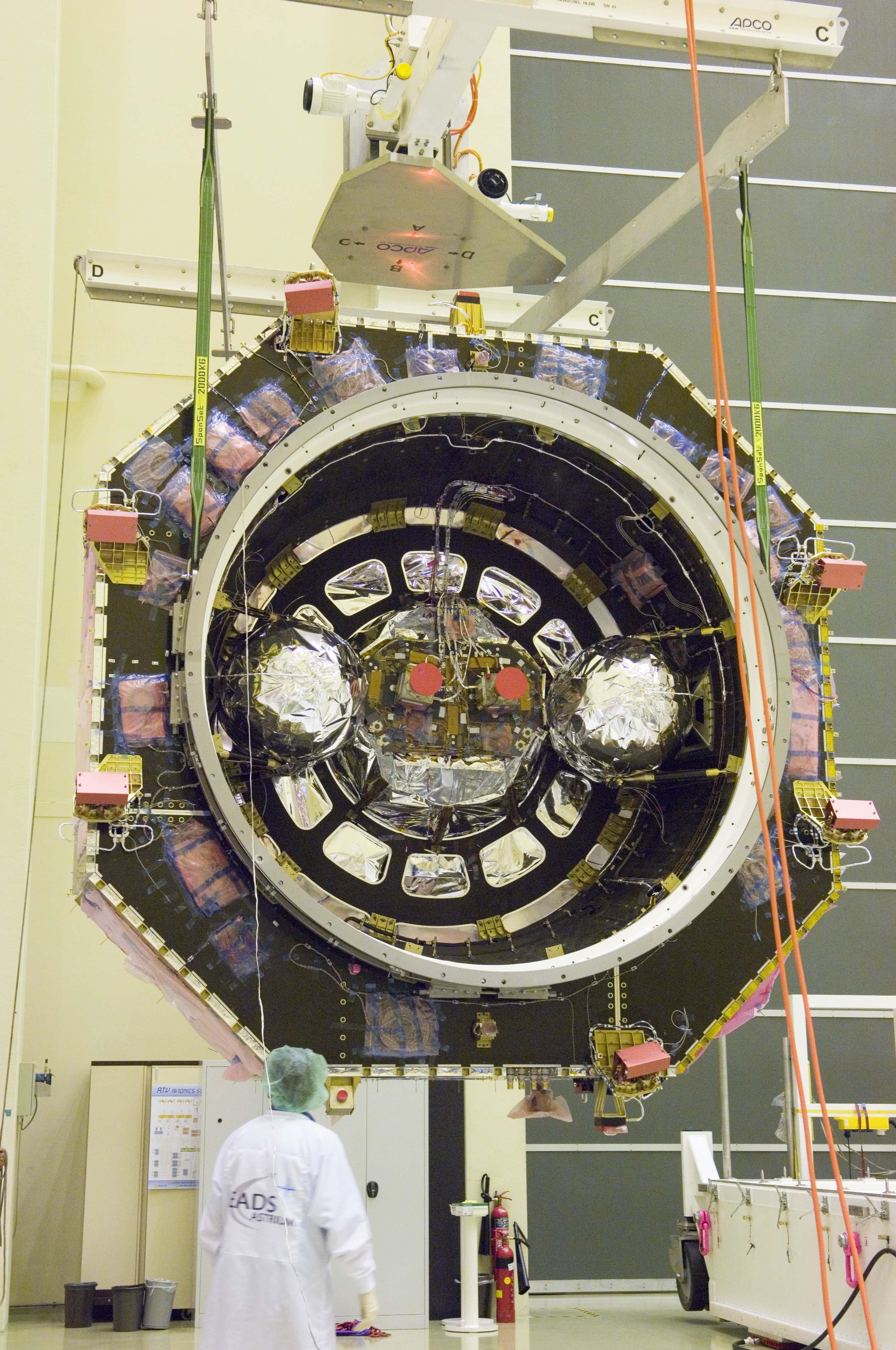 Herschel's service module is seen from below as the spacecraft flight model is hanging from a crane. The spacecraft is being hoisted from its transporter truck onto the multi-purpose trolley inside the cleanroom at ESTEC.