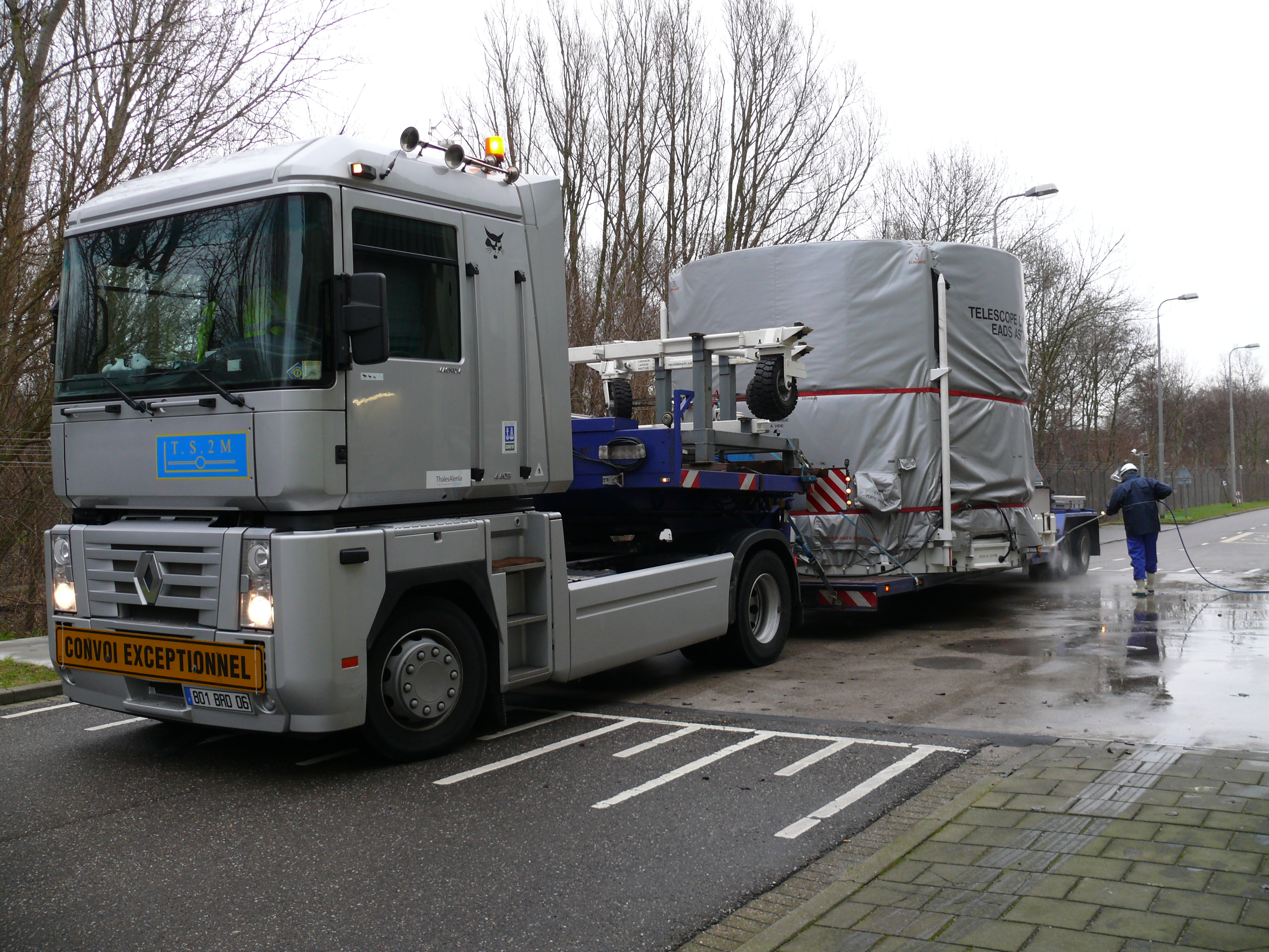 In the morning of 18 January 2008, the Herschel telescope flight model arrived at ESTEC where it will be integrated with the Herschel spacecraft. The 3.5-metre diameter telescope is seen housed in its transport container on the transporter truck.