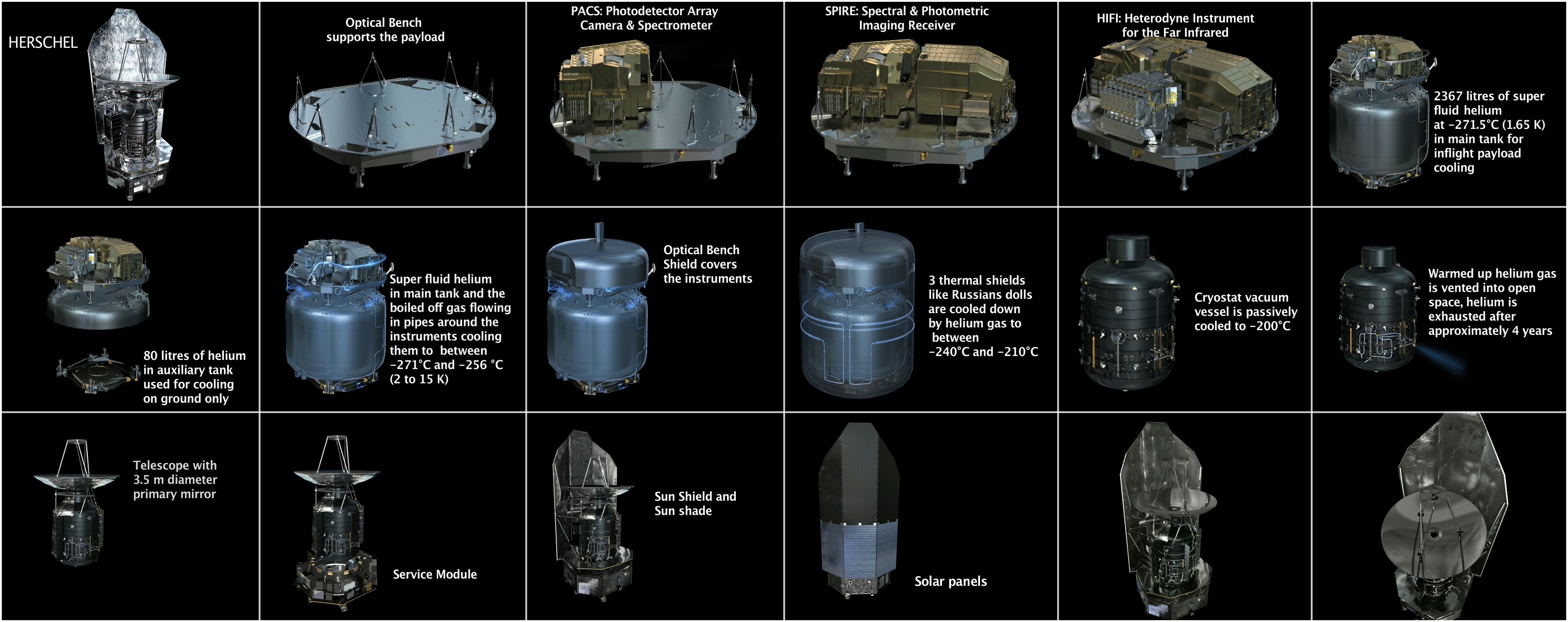From top left to bottom right, the image shows the detailed build-up of the Herschel cooling system and the main spacecraft components, from inside the cryostat vacuum vessel (CVV) out to the entire spacecraft with its telescope, service module, Sun shield/shade and solar panels.