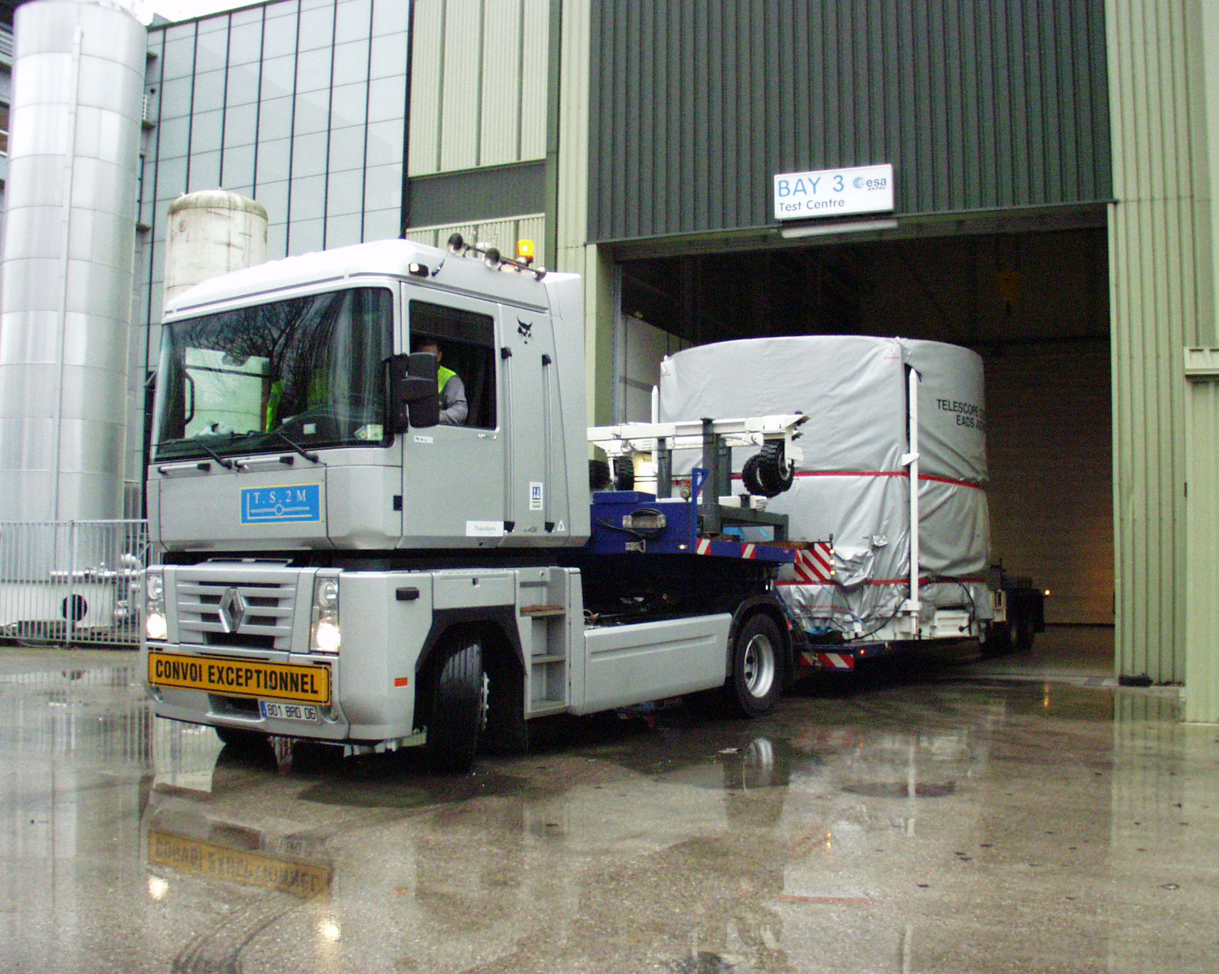 In the morning of 18 January 2008, the Herschel telescope flight model arrived at ESTEC where it will be integrated with the Herschel spacecraft. The transporter truck with the telescope container is backing up into the cleanroom loading bay-airlock #3.