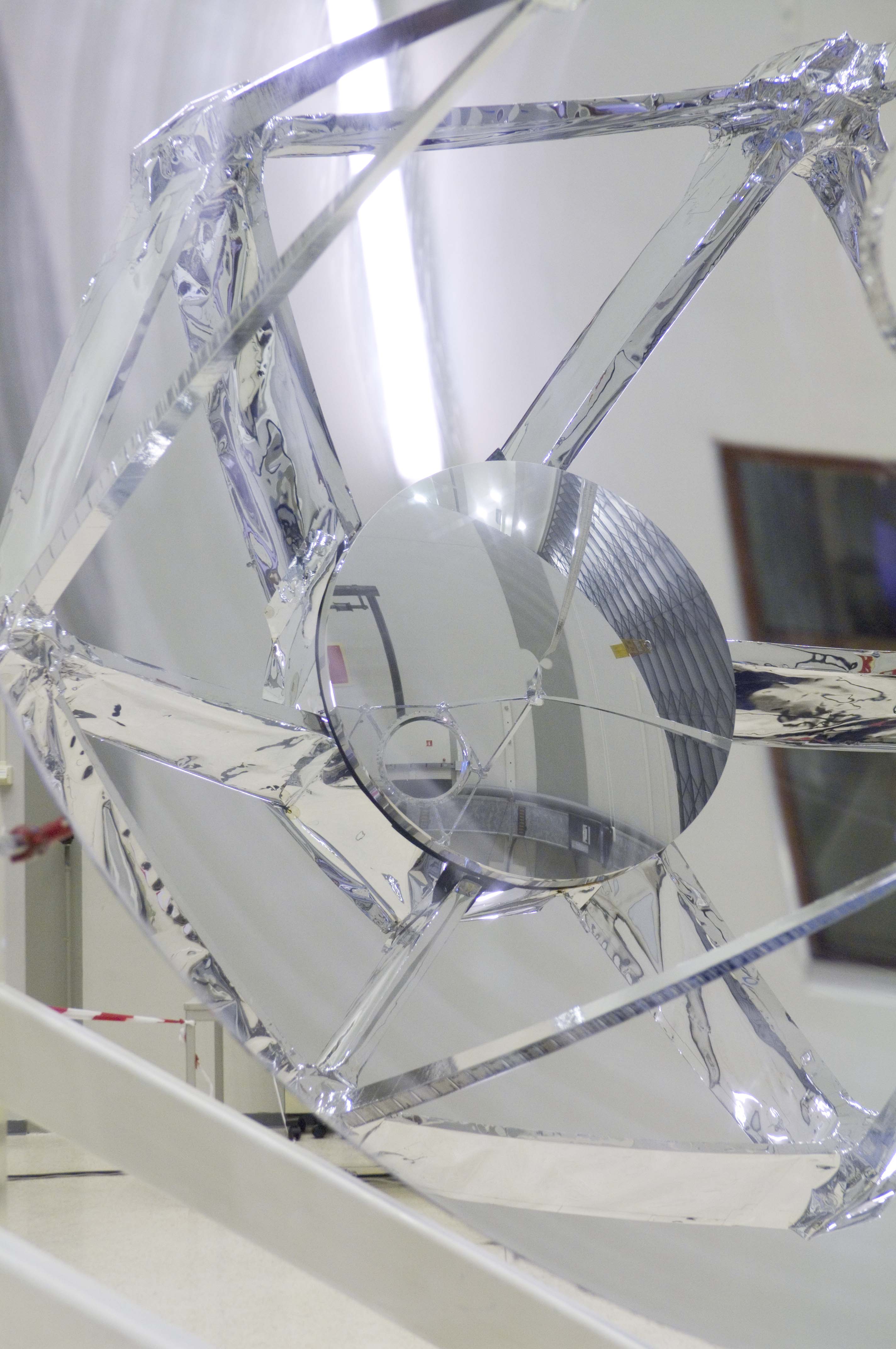 In this close-up view of the primary mirror of the Herschel telescope, the smaller secondary mirror and its support structure are seen reflected. Inside the reflection of the secondary mirror you look back at the primary mirror where at lower left its central hole can be seen through which the light will pass onto the spacecraft instruments.