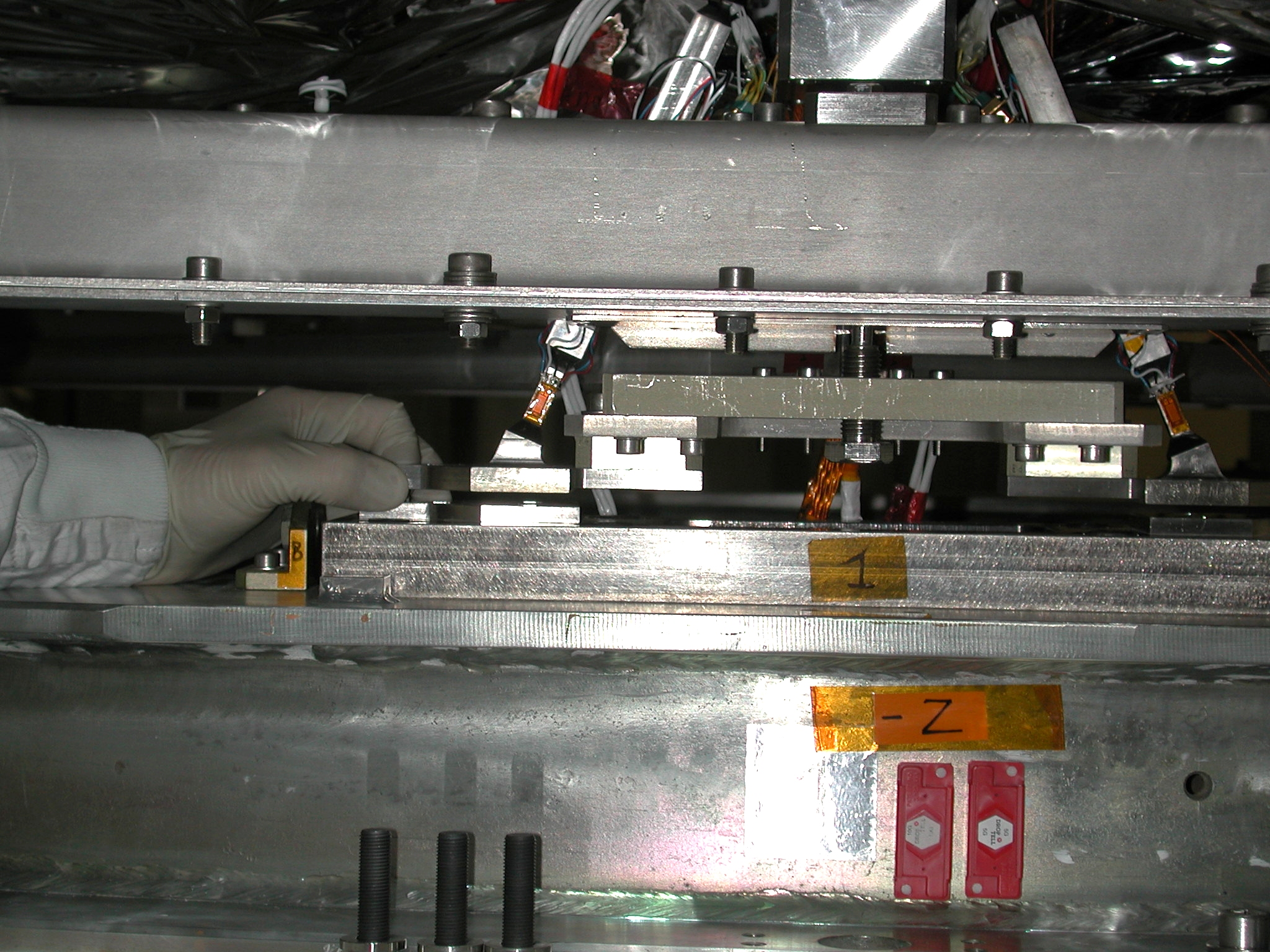 Close-up view of one of the three bipods that form the interface between the telescope and cryostat vacuum vessel. This image was taken during the fit-check of the telescope flight model on a reference plate. The bipod is visible behind the bolted bar runing across the top of the image.