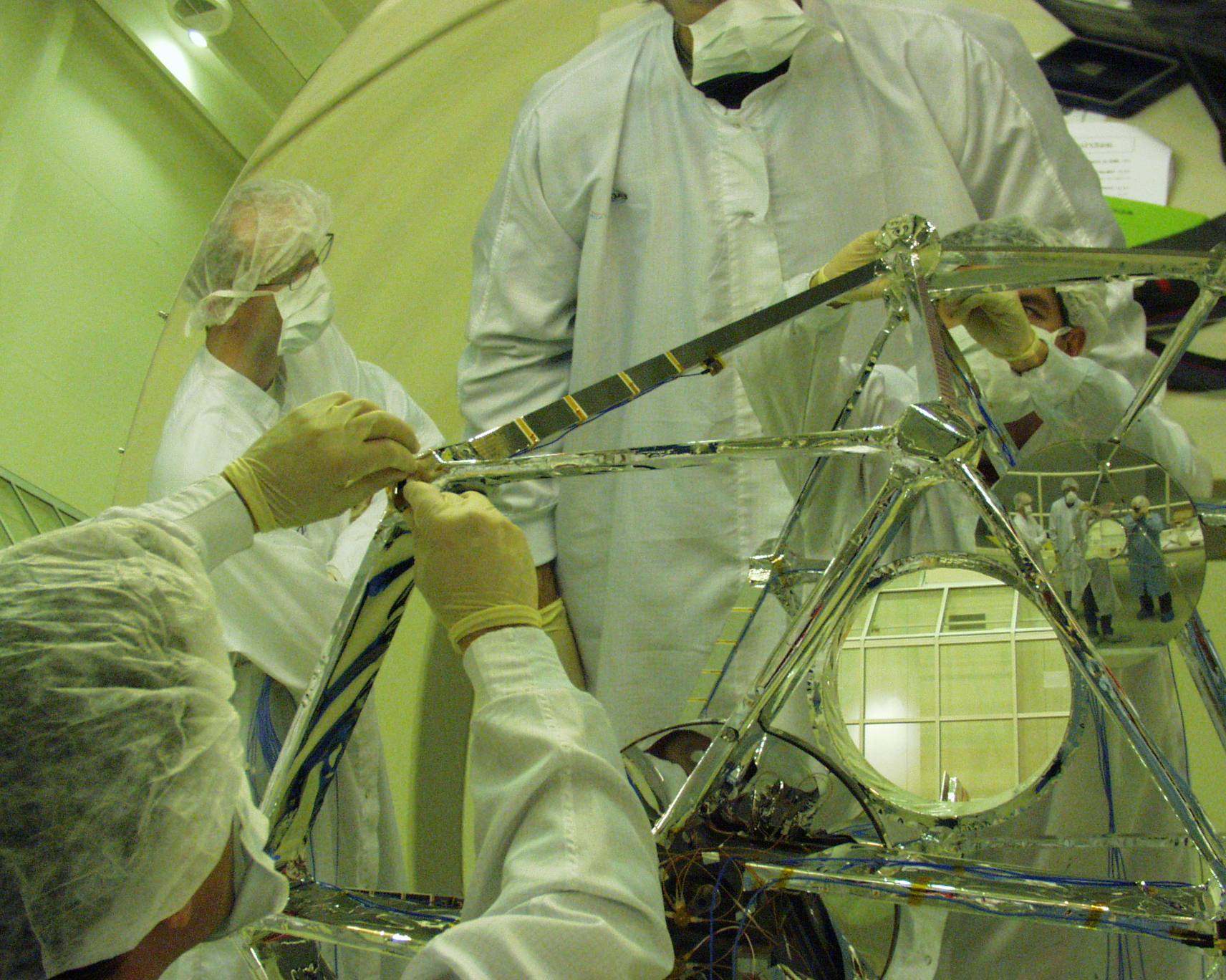 Date: 18 April 2008 Satellite: Herschel Depicts: Close-up of accelerometers being installed on Herschel M2 mirror prior to telescope integration Location: ESTEC Copyright: ESA Show in archive: true