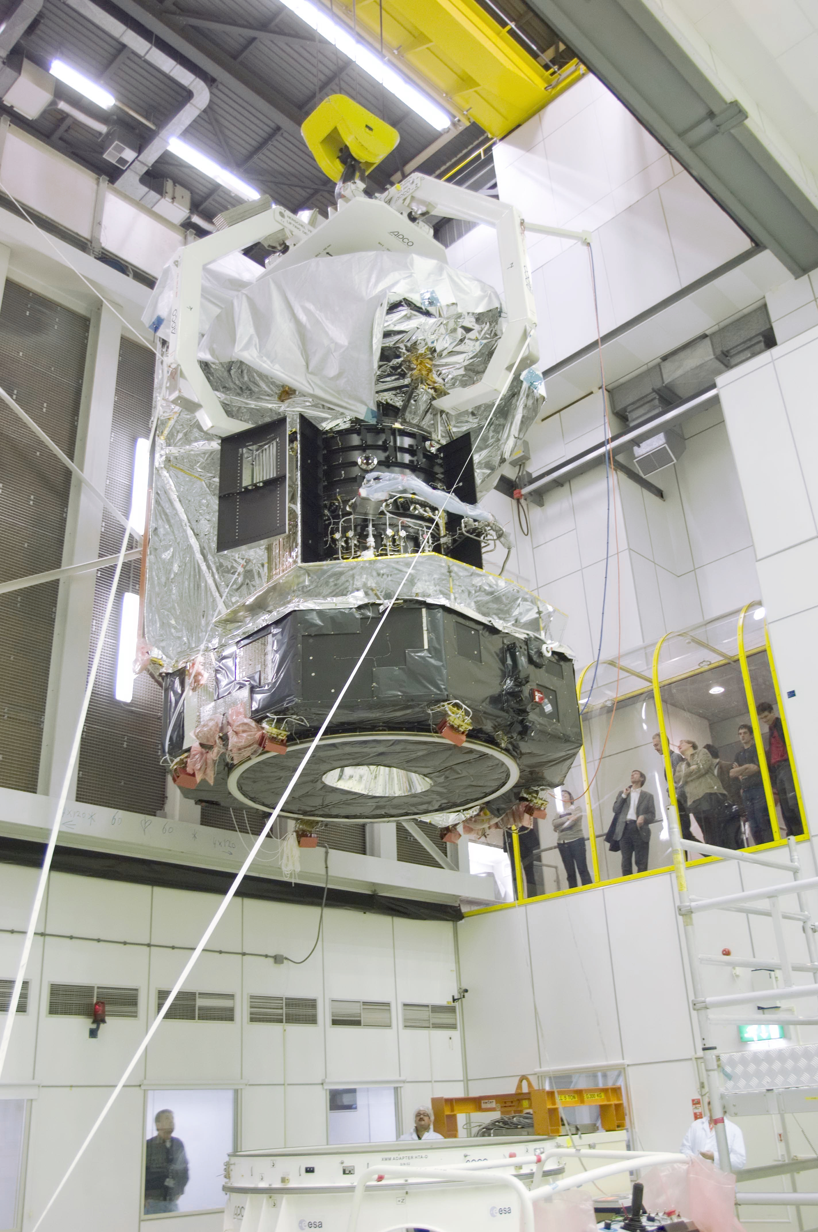 The Herschel spacecraft is raised to almost roof level in the clean room before being transferred into the LSS.