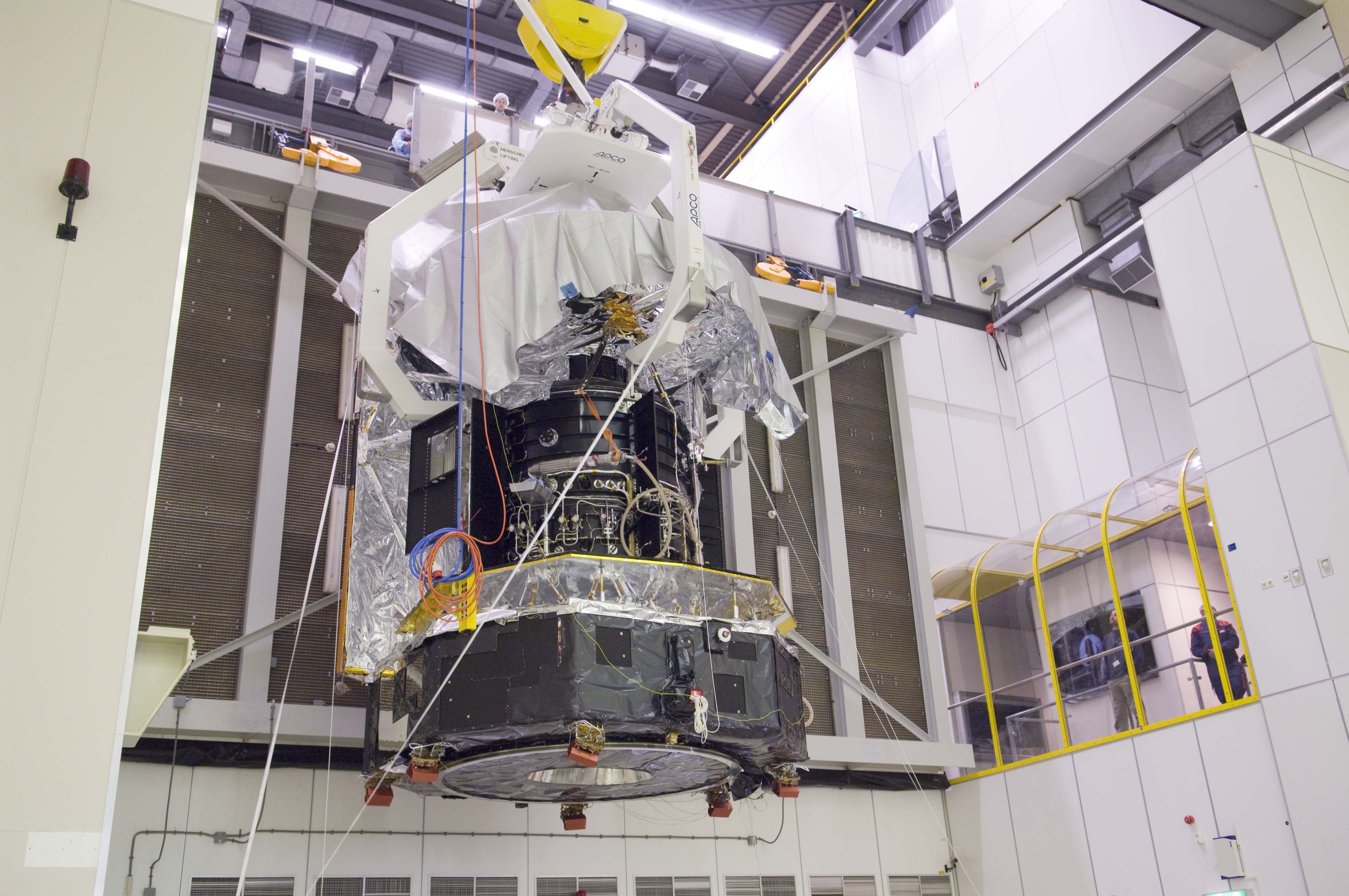 This image shows Herschel being lowered from a platform at the top of the LSS after the spacecraft was lifted through the top opening of the LSS chamber. The telescope is covered by a protective foil to protect the contamination sensitive surface of the telescope's primary mirror.
