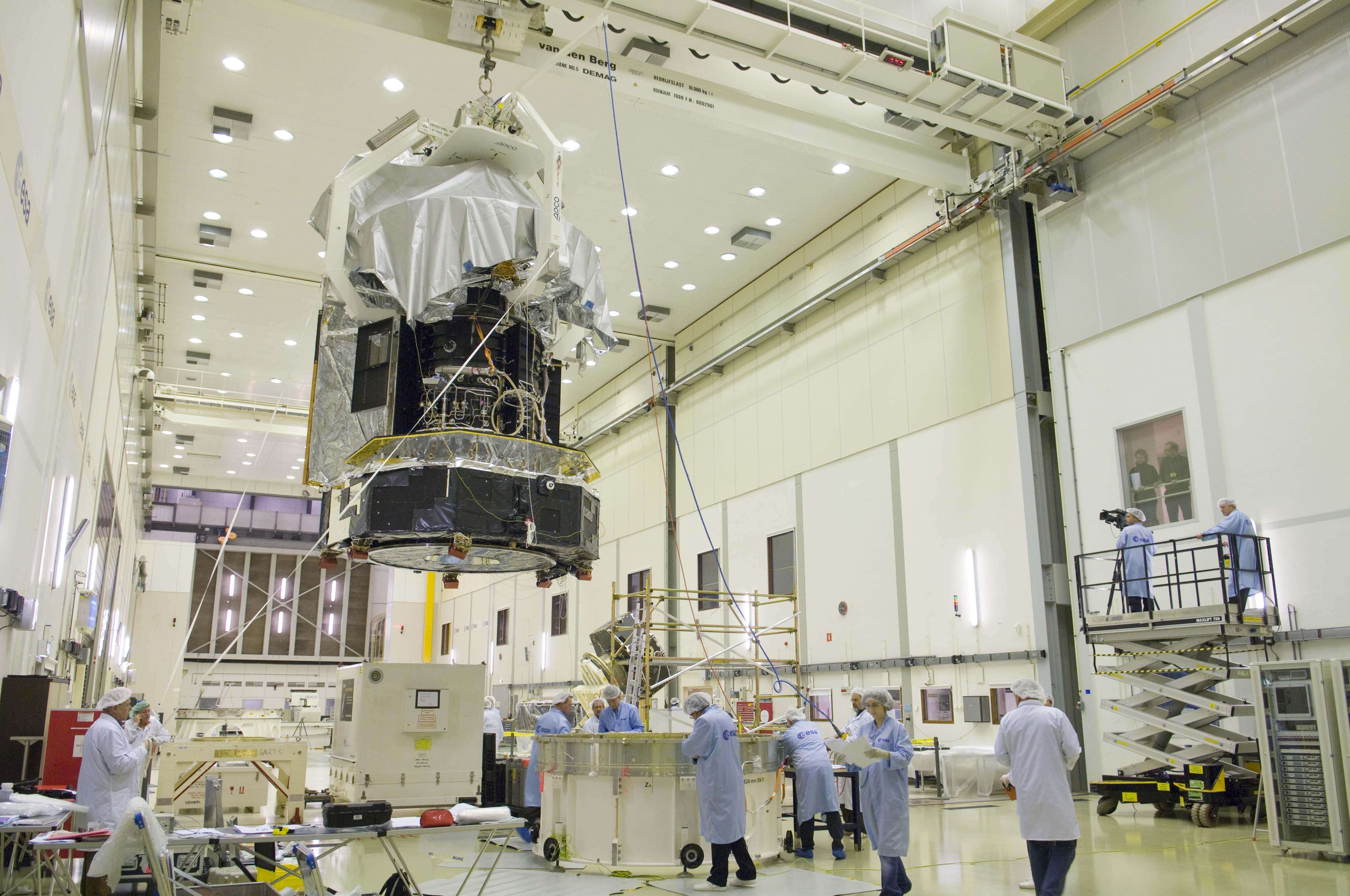 On 8 January, after its removal from the LSS earlier that day, the Herschel flight model spacecraft is transferred across the cleanroom by an overhead crane to be placed on top of the flight adapter of the Ariane 5 launcher for a fit check.