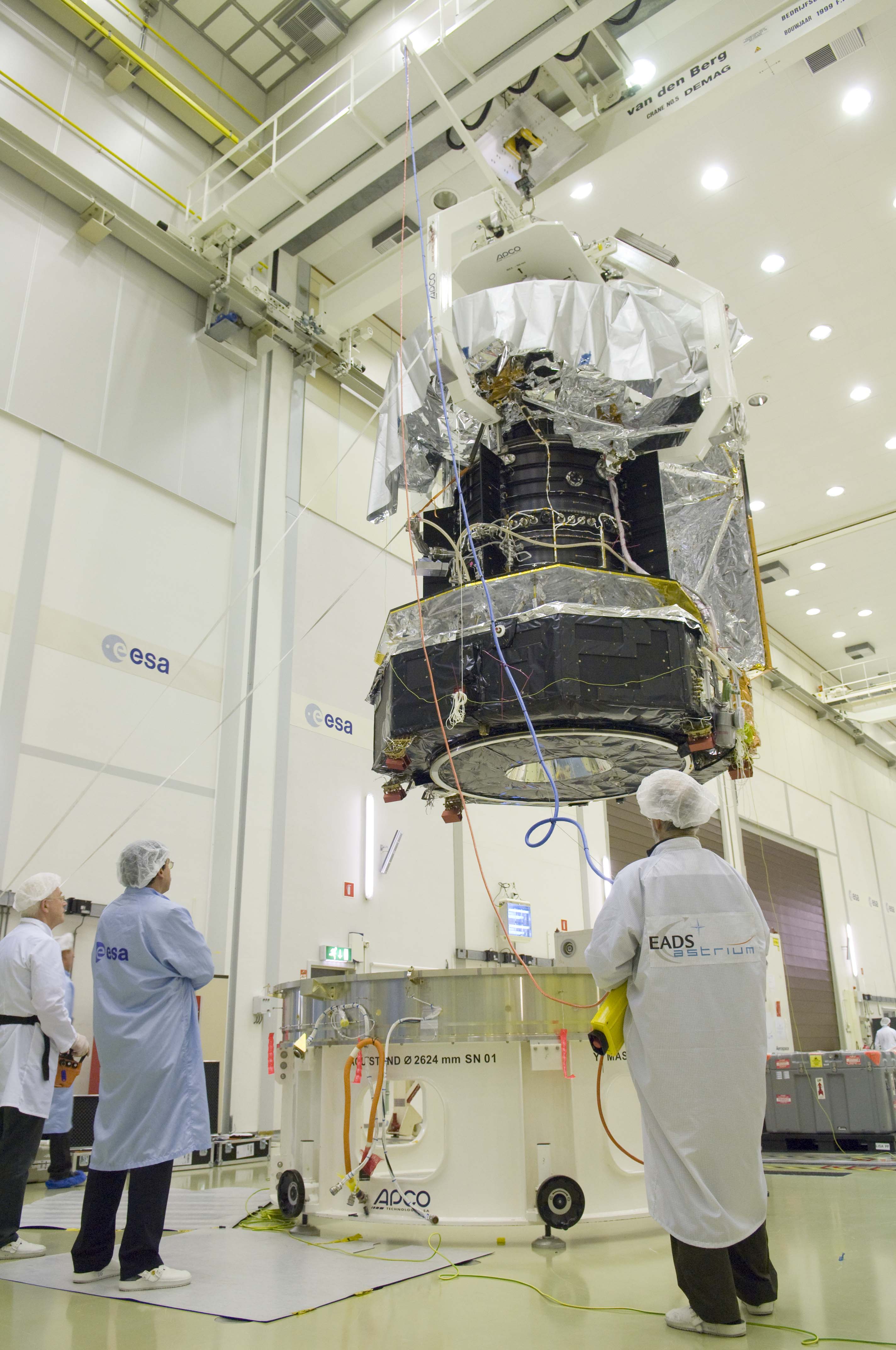 On 8 January, after its removal from the LSS earlier that day, the Herschel flight model spacecraft is transferred across the cleanroom by an overhead crane to be placed on top of the flight adapter of the Ariane 5 launcher for a fit check.
