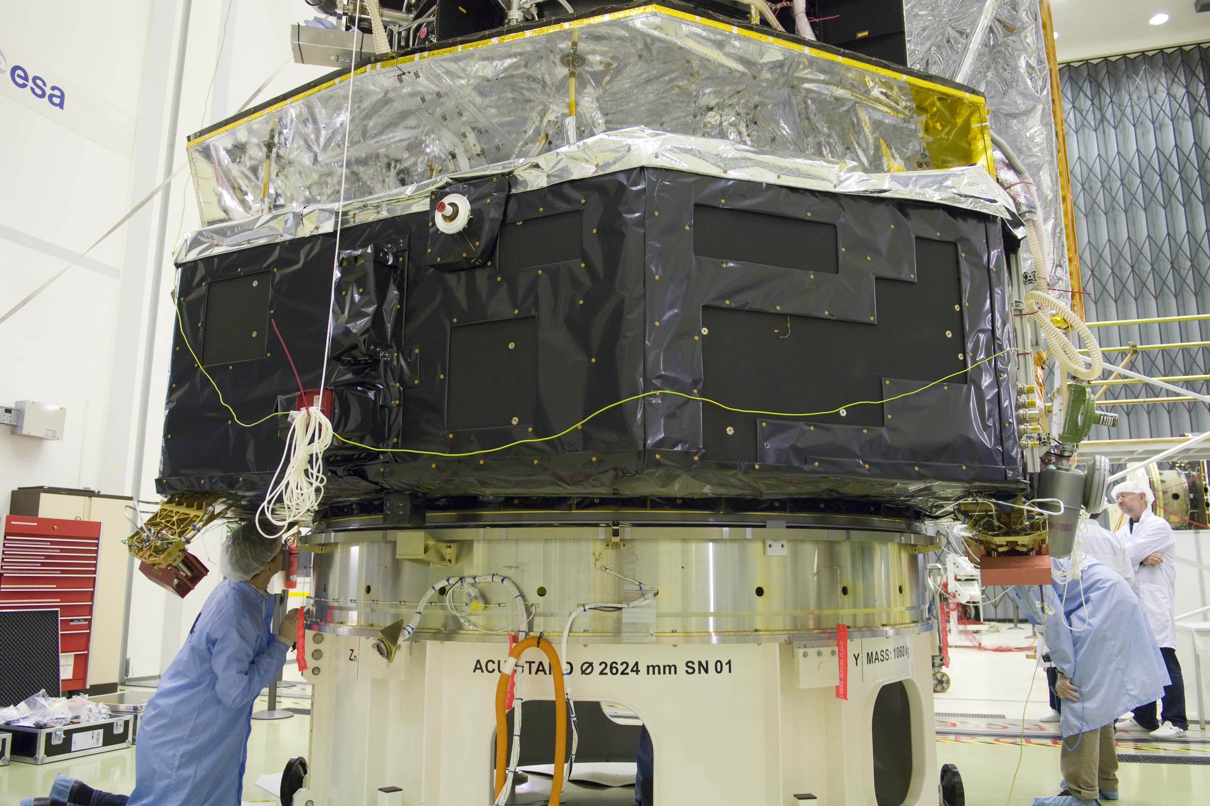 On 8 January, after its removal from the Large Space Simulator earlier that day, the Herschel flight model spacecraft is placed on top of the flight adapter of the Ariane 5 launcher for a fit check.