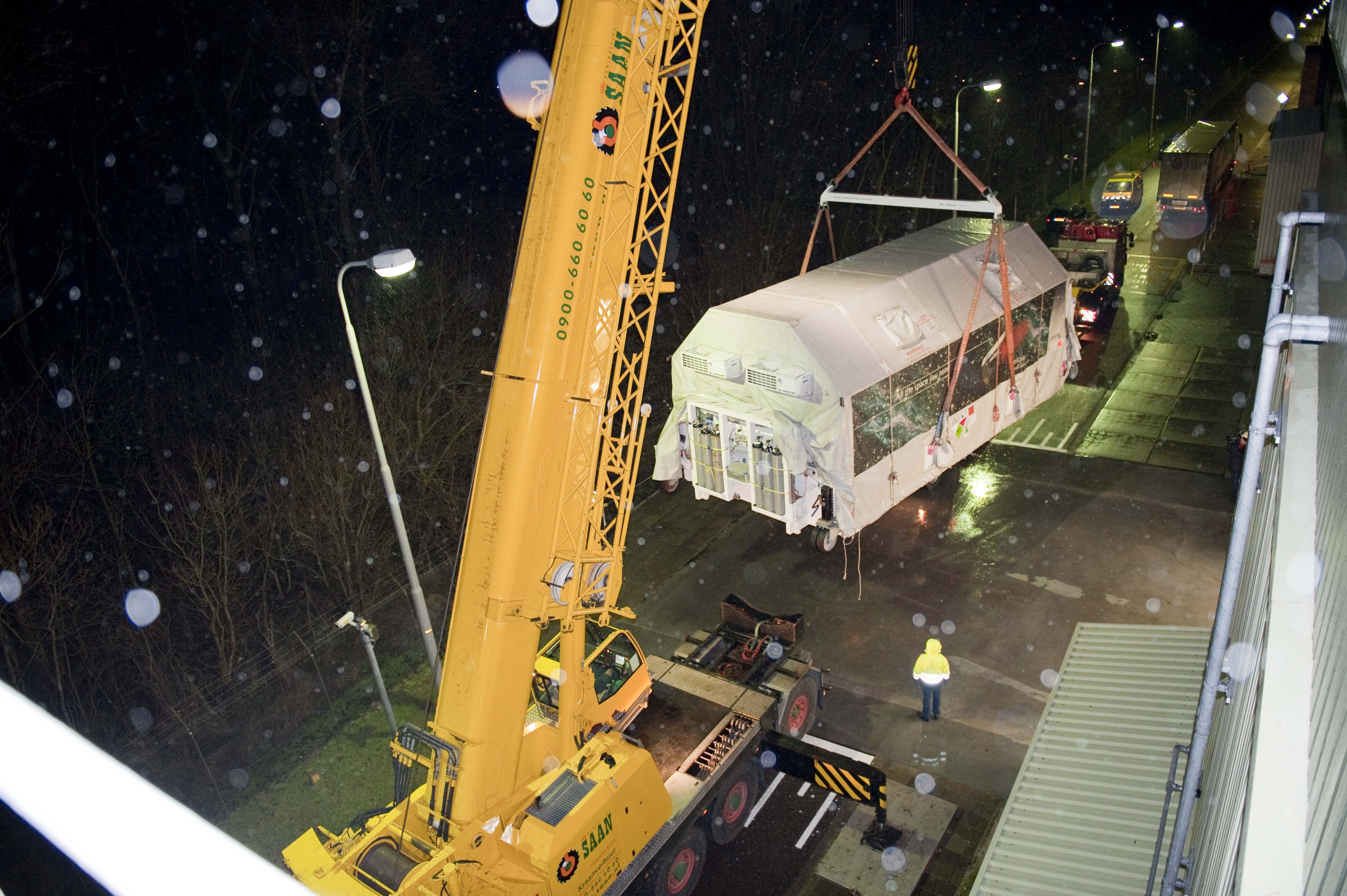 Date: 09 February 2009 Satellite: Herschel Depicts: Transport container with Herschel, hoisted by crane Location: ESTEC, Noordwijk, The Netherlands Copyright: ESA Show in archive: true